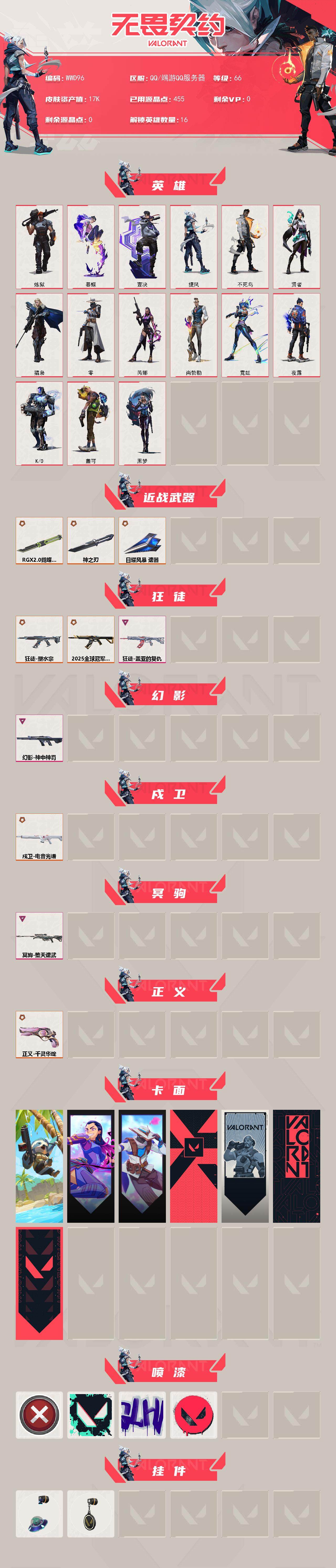 商品描述:【WWD96】终极*7/卓越*3/皮肤*33/等级*66/段位:未定级/炼狱/暮蝶/壹决/捷风/不死鸟/贤者/猎枭/零/芮娜/尚勃勒/霓虹/夜露/K/O/盖可/黑梦/近战武器-神之刃/近战武器-RGX 11z Pro//2.0 蝴蝶刀/近战武器-日耀风暴 遗器/狂徒-2025全球冠军赛/狂徒-塑水宗/狂徒-盖亚的复仇/幻影-神中神罚/戍卫-电音光谱/冥驹-堕天遗武/正义-千灵华绽/树懒大作战 卡面/无畏契约GO!第一卷:芮娜 卡面/无畏契约GO!第一卷:零 卡面/代号红色 卡面/新兵报到 卡面/V契约 卡面/无畏契约 卡面/买装还是存钱 喷漆/胜利属于无畏契约 喷漆/GLHF 喷漆/无畏契约