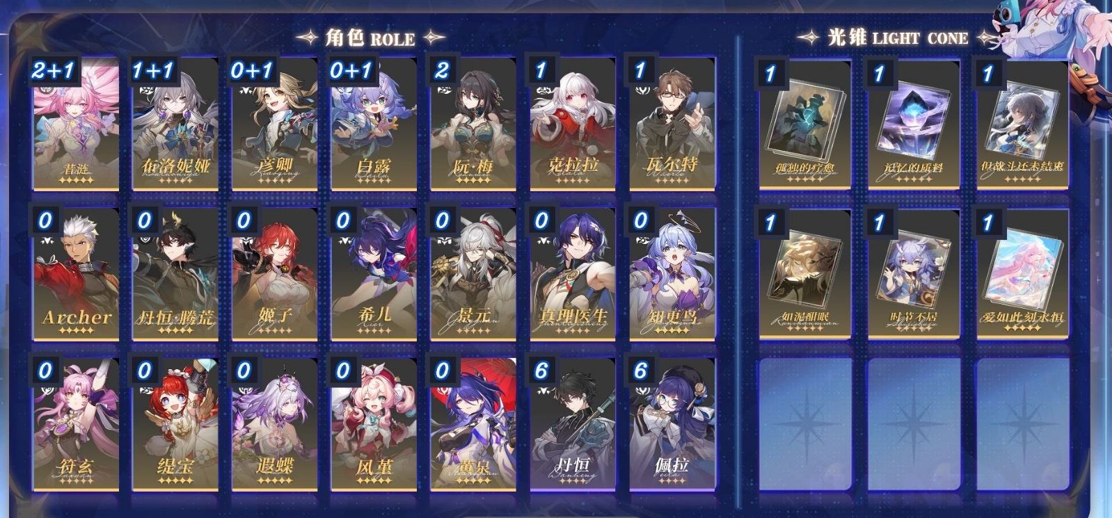 【崩坏·星穹铁道】【LYXQ6817】冒险等级:68,女主,五星数量:17,绑定情况:邮箱__五星角色:白厄 * 6命|Saber|阮·梅|刻律德菈|布洛妮娅|符玄|Archer|丹恒·腾荒|彦卿|杰帕德|真理医生__五星光锥:黎明恰如此燃烧 * 5精|记忆永不落幕 * 5精|时节不居 * 2精|无可取代的东西|理想燃烧的地狱|银河铁道之夜,【邮箱未实名】[13684071]m23836,70级,女主,36黄,梦华34,星琼90,星轨专票0,星轨通票3,16个五星角色:3命白厄,1命布洛妮娅,1命阮梅,1命白露,1命克拉拉,1命杰帕德,星期日,丹恒腾荒,刻律德菈,Archer,大黑塔,遐蝶,真理医生,姬子,彦卿,瓦尔特,8个五星光锥:精5不息的演算,精1黎明恰如此燃烧,精1星海巡航,精1理想燃烧的地狱,精1回到大地的飞行,精1记一位星神的陨落,精1记忆永不落幕,精1时节不居