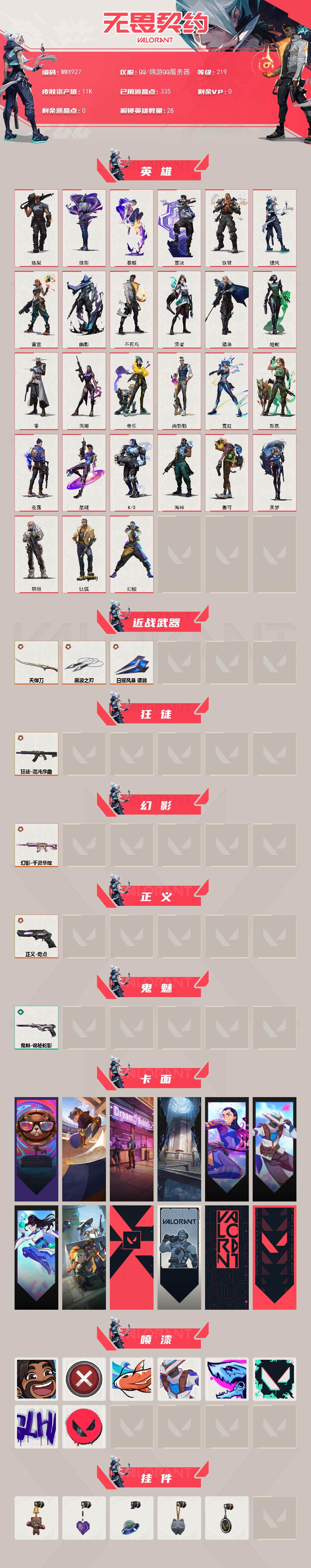 【套装】:2022全球冠军赛套装【英雄】:炼狱,暮蝶,铁臂,捷风,不死鸟,贤者,猎枭,芮娜,K/O【近战 武器】:近战武器-2022全球冠军赛 蝴蝶刀【幻影】:幻影-2022全球冠军赛【正义】:正义-奇点【鬼魅】:鬼魅-扑棱扑棱【卡面】:无畏契约:暮蝶 卡面,无畏契约GO!第一卷:芮娜 卡面,无畏契约GO!第一卷:零 卡面,代号红色 卡面,新兵报到 卡面,V契约 卡面,无畏契约 卡面【喷漆】:伤心心 喷漆,买装还是存钱 喷漆,红鳞 喷漆,无畏契约GO!第一卷:贤者 喷漆,暴走萝莉 喷漆,胜利属于无畏契约 喷漆,GLHF 喷漆,无畏契约 喷漆【挂饰】:天外飞客 挂饰,《双城之战》魄罗 挂饰,无畏契约 纪念币 挂饰【WWSA213】终极*24/卓越*9/皮肤*101/等级*127/段位:钻石/2024全球冠军赛套装/奇点//2.0套装/般若假面//2.0套装/幻棱/炼狱/维斯/暮蝶/钛狐/壹决/铁臂/捷风/雷兹/幽影/不死鸟/贤者/猎枭/蝰蛇/零/芮娜/奇乐/尚勃勒/霓虹/斯凯/夜露/星礈/K/O/海神/盖可/黑梦/钢锁/近战武器-2024全球冠军赛 战刀/近战武器-影钩/近战武器-RGX 11z Pro//2.0 蝴蝶刀/近战武器-侦察力量 蝴蝶刀/近战武器-剥皮小刀/近战武器-奇点//2.0 蝴蝶刀/近战武器-紫金爪刀/近战武器-RGX 11z Pro//3.0 爪刀/近战武器-鬼丸国纲/近战武器