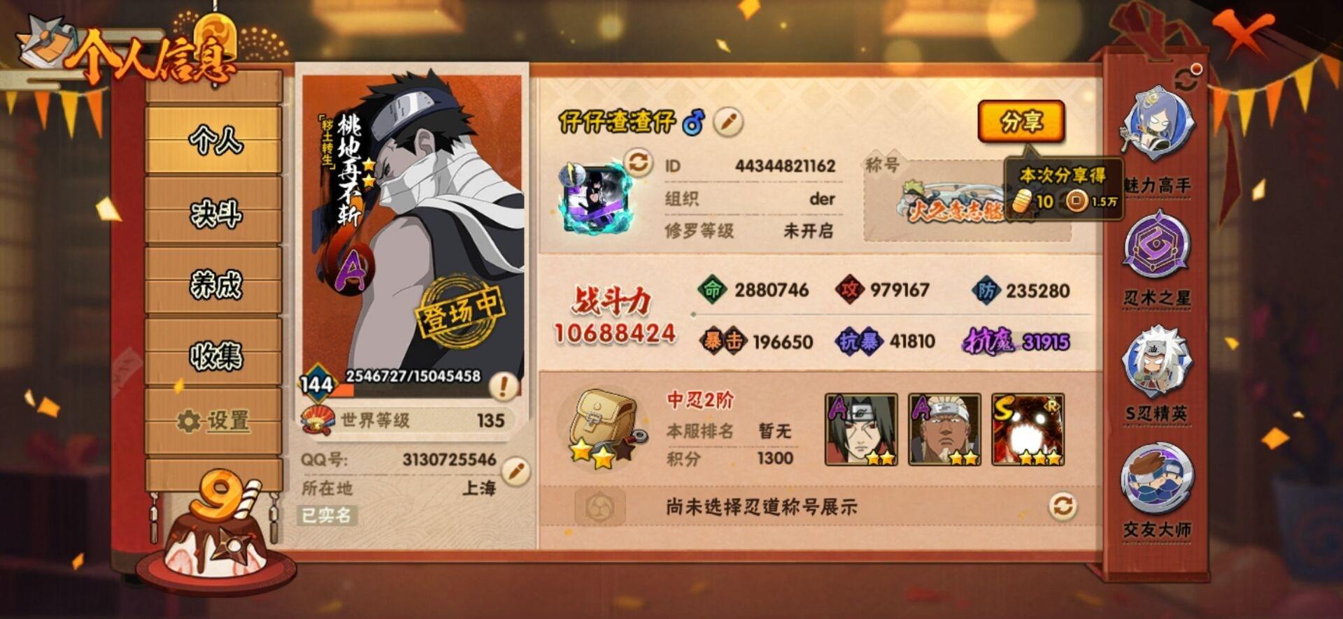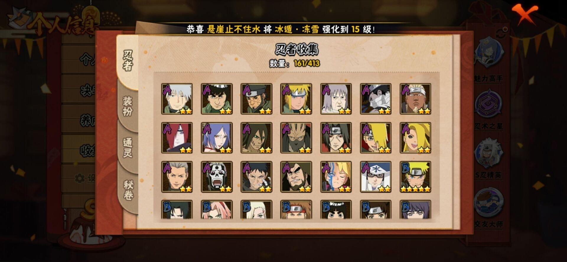 苹果Q708区:可二次实名 VIP15,1524W战力,S忍27个,A忍56个,本服排名22,战区排名未上榜,通灵兽34个,9时装,暗部1阶,忍者星数574