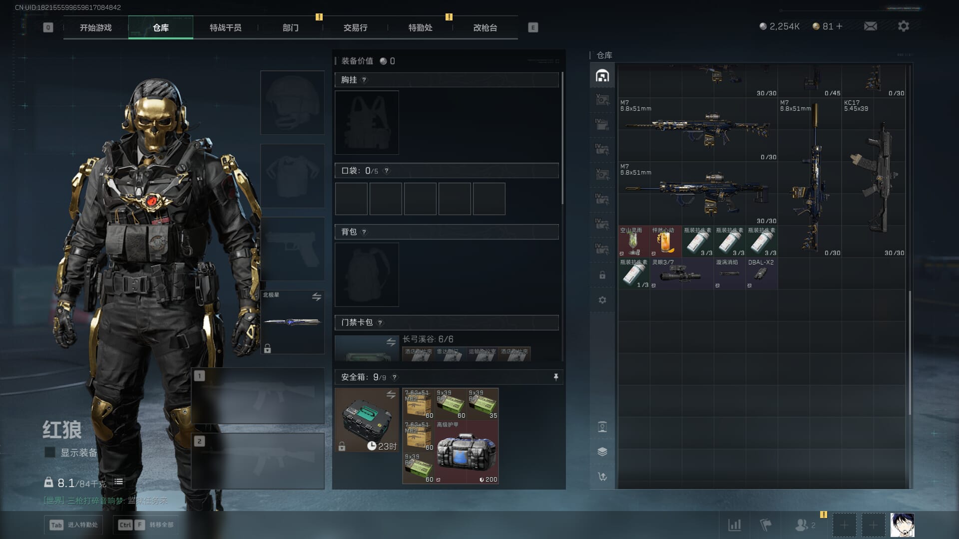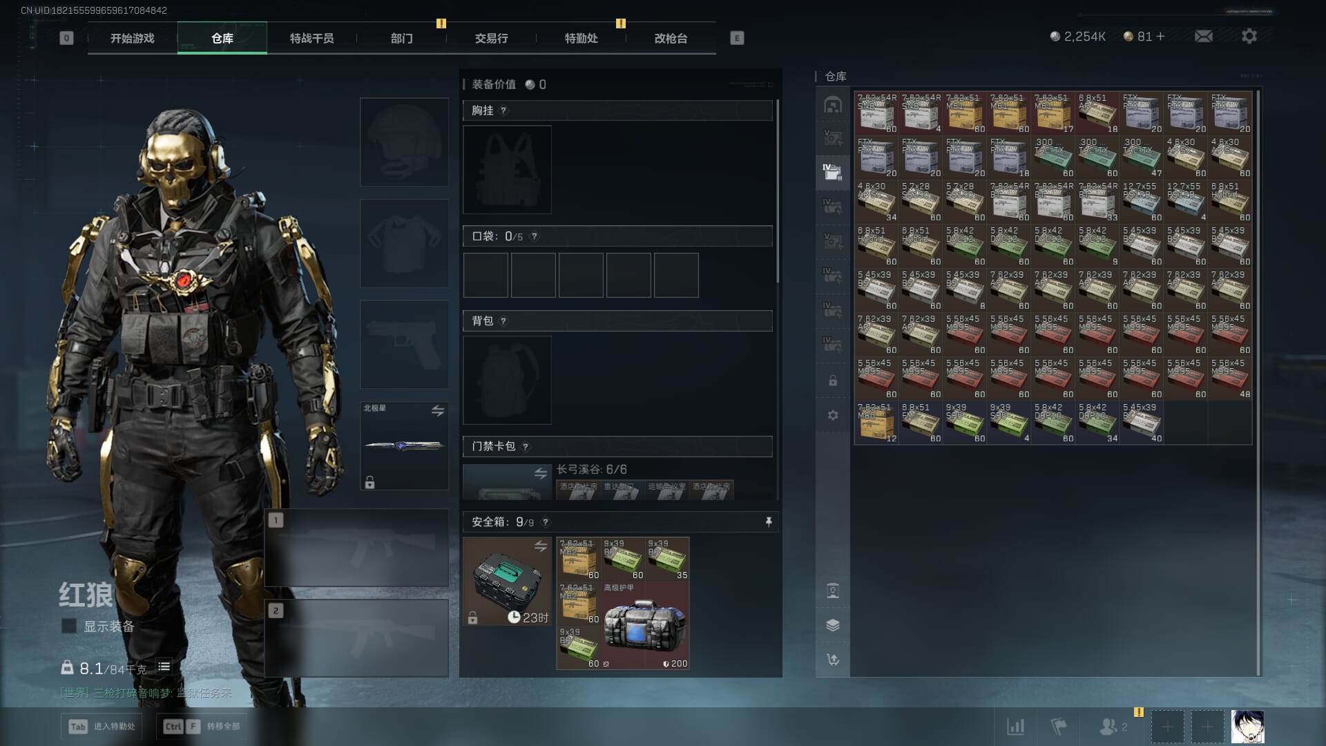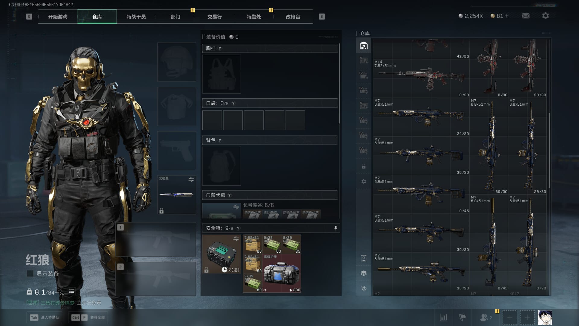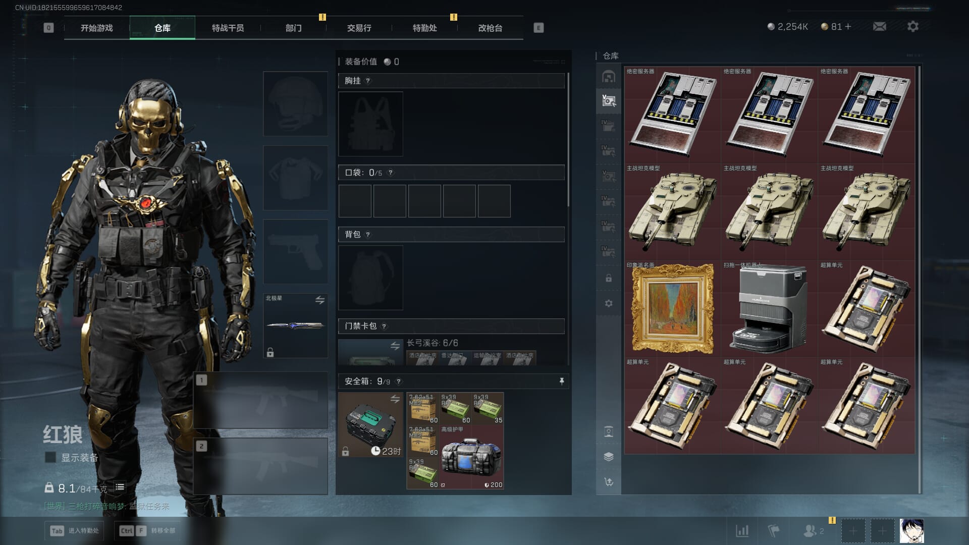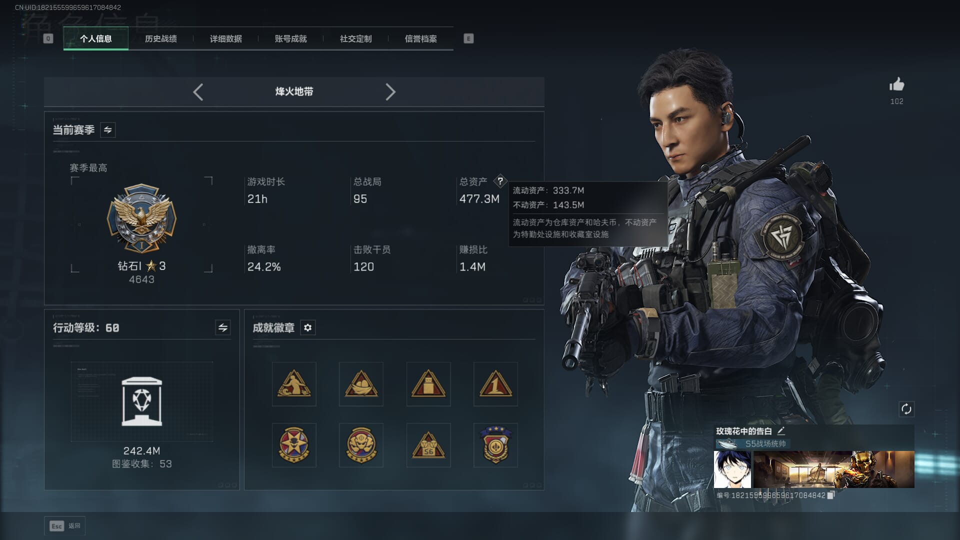 总资产:59.8M,哈夫币:260W,武器皮肤:25,钻石,战场60级:【安全箱】基础安全箱;【特勤处等级】仓库LV.8,靶场LV.7,训练中心LV.7;【干员皮肤】蜂医送葬人无题密令,无名夜鹰,红狼蚀金玫瑰;【近战武器】近战武器-北极星,近战武器-黑鹰;【步枪皮肤】M4A1突击步枪-蚀金玫瑰,M7战斗步枪-神秘艺术,SR-25射手步枪-水墨云图,ASVal突击步枪-蛇年祥瑞,AK-12突击步枪-夜鹰,K437突击步枪-北极星,CAR-15突击步枪-阿米娅,腾龙突击步枪-捞点薯条,AK-12突击步枪-特斯拉线圈,M4A1突击步枪-阿米娅,SCAR-H战斗步枪-启航,KC17突击步枪-电锯惊魂,SG552突击步枪-运动员;【冲锋枪皮肤】P90冲锋枪-神秘艺术,QCQ171冲锋枪-北极星,SMG-45冲锋枪-骑士,UZI冲锋枪-特斯拉线圈,SR-3M紧凑突击步枪-特斯拉线圈,勇士冲锋枪-能天使-午夜邮差;【狙击步枪皮肤】AWM狙击步枪-捞点薯条;【霰弹枪皮肤】725双管霰弹枪-送葬人-无题密令;【轻机枪皮肤】M250通用机枪-骑士之心;【手枪皮肤】93R-捞点薯条;