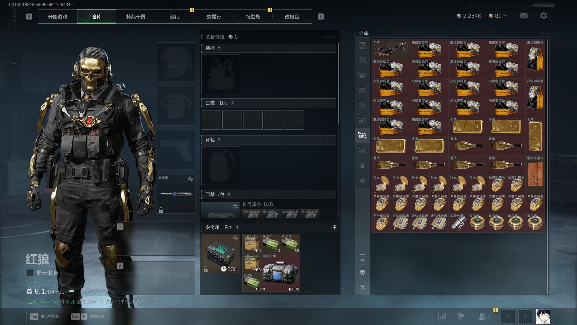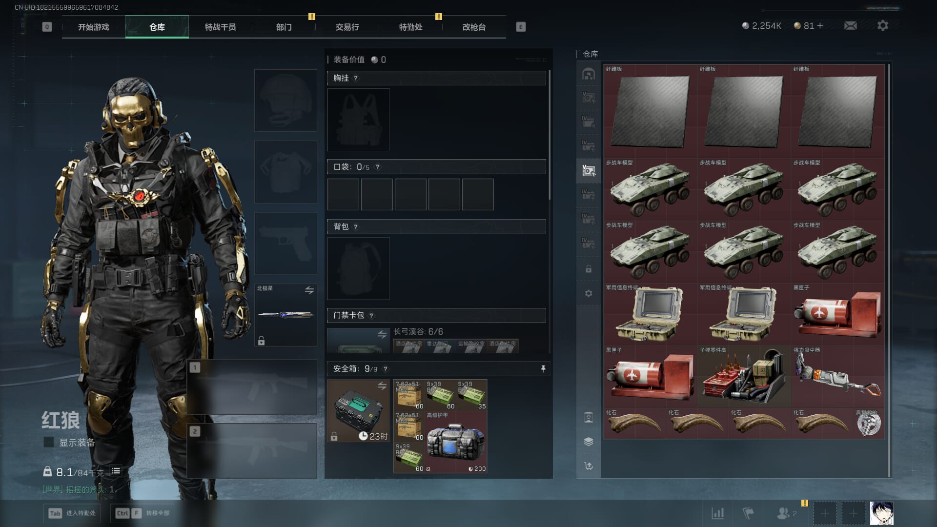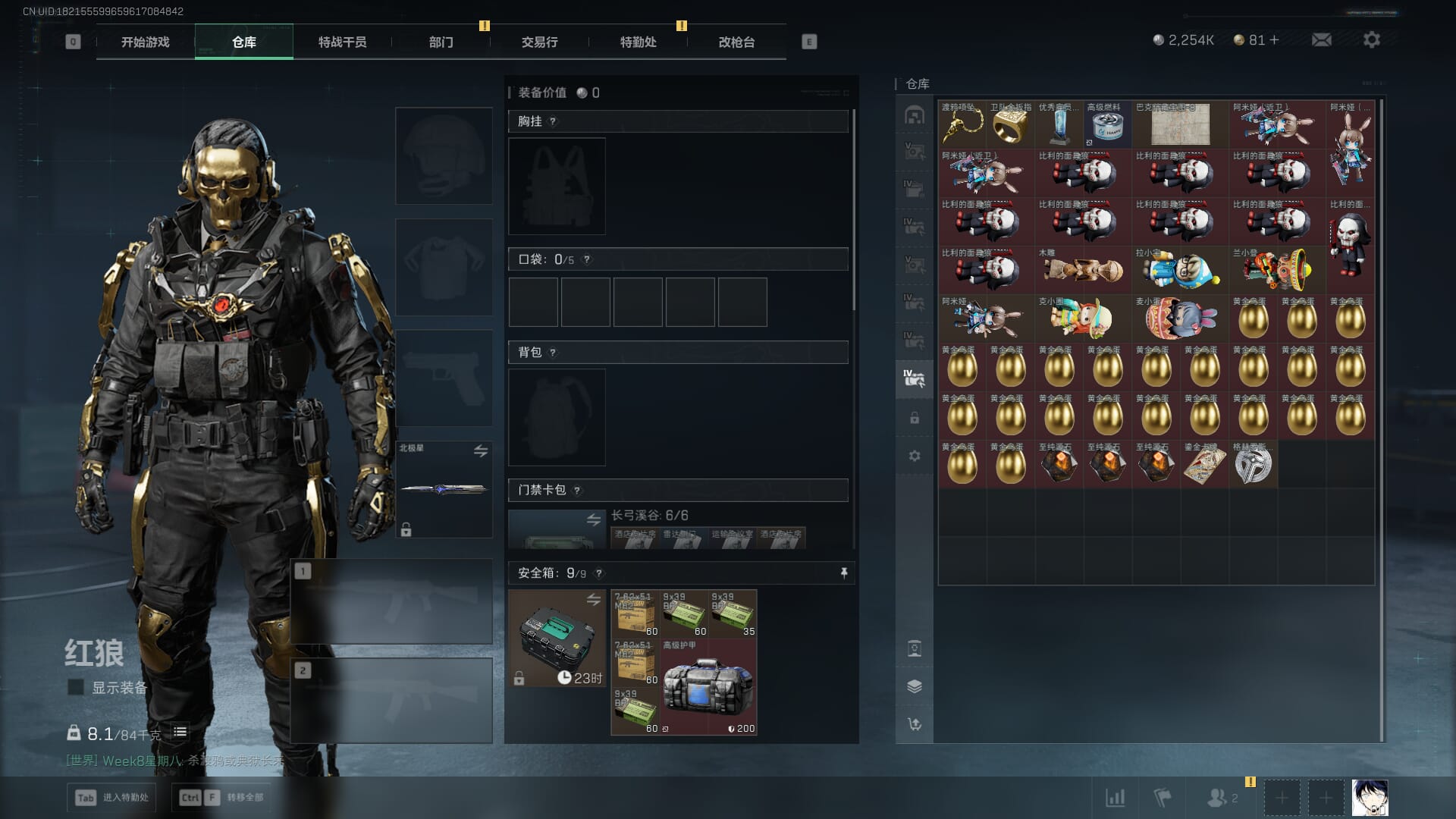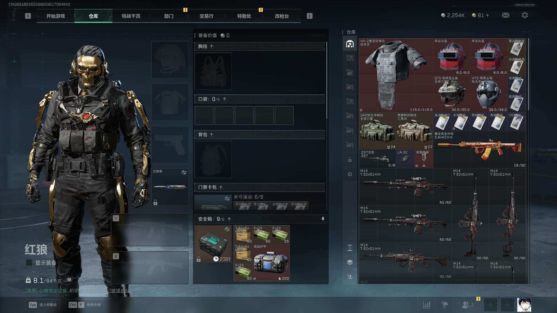 总资产:59.8M,哈夫币:260W,武器皮肤:25,钻石,战场60级:【安全箱】基础安全箱;【特勤处等级】仓库LV.8,靶场LV.7,训练中心LV.7;【干员皮肤】蜂医送葬人无题密令,无名夜鹰,红狼蚀金玫瑰;【近战武器】近战武器-北极星,近战武器-黑鹰;【步枪皮肤】M4A1突击步枪-蚀金玫瑰,M7战斗步枪-神秘艺术,SR-25射手步枪-水墨云图,ASVal突击步枪-蛇年祥瑞,AK-12突击步枪-夜鹰,K437突击步枪-北极星,CAR-15突击步枪-阿米娅,腾龙突击步枪-捞点薯条,AK-12突击步枪-特斯拉线圈,M4A1突击步枪-阿米娅,SCAR-H战斗步枪-启航,KC17突击步枪-电锯惊魂,SG552突击步枪-运动员;【冲锋枪皮肤】P90冲锋枪-神秘艺术,QCQ171冲锋枪-北极星,SMG-45冲锋枪-骑士,UZI冲锋枪-特斯拉线圈,SR-3M紧凑突击步枪-特斯拉线圈,勇士冲锋枪-能天使-午夜邮差;【狙击步枪皮肤】AWM狙击步枪-捞点薯条;【霰弹枪皮肤】725双管霰弹枪-送葬人-无题密令;【轻机枪皮肤】M250通用机枪-骑士之心;【手枪皮肤】93R-捞点薯条;