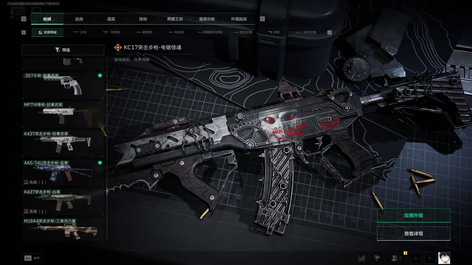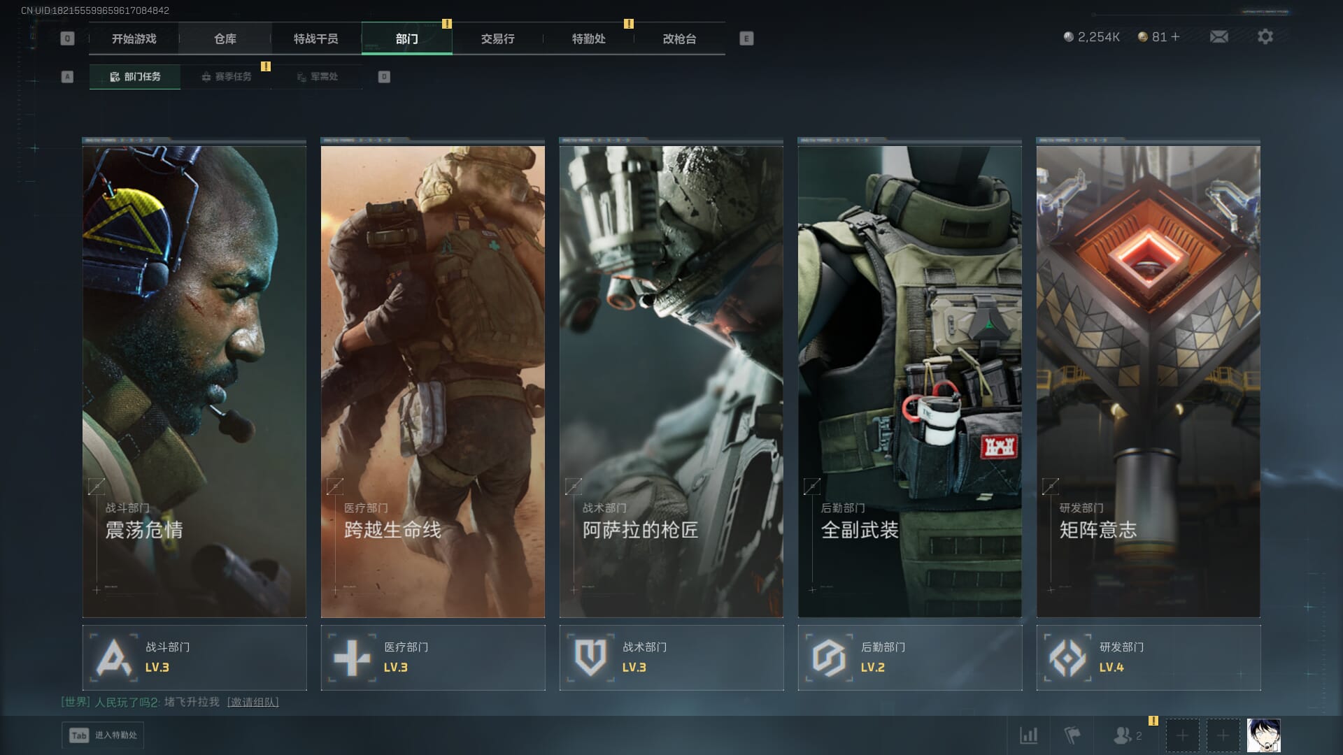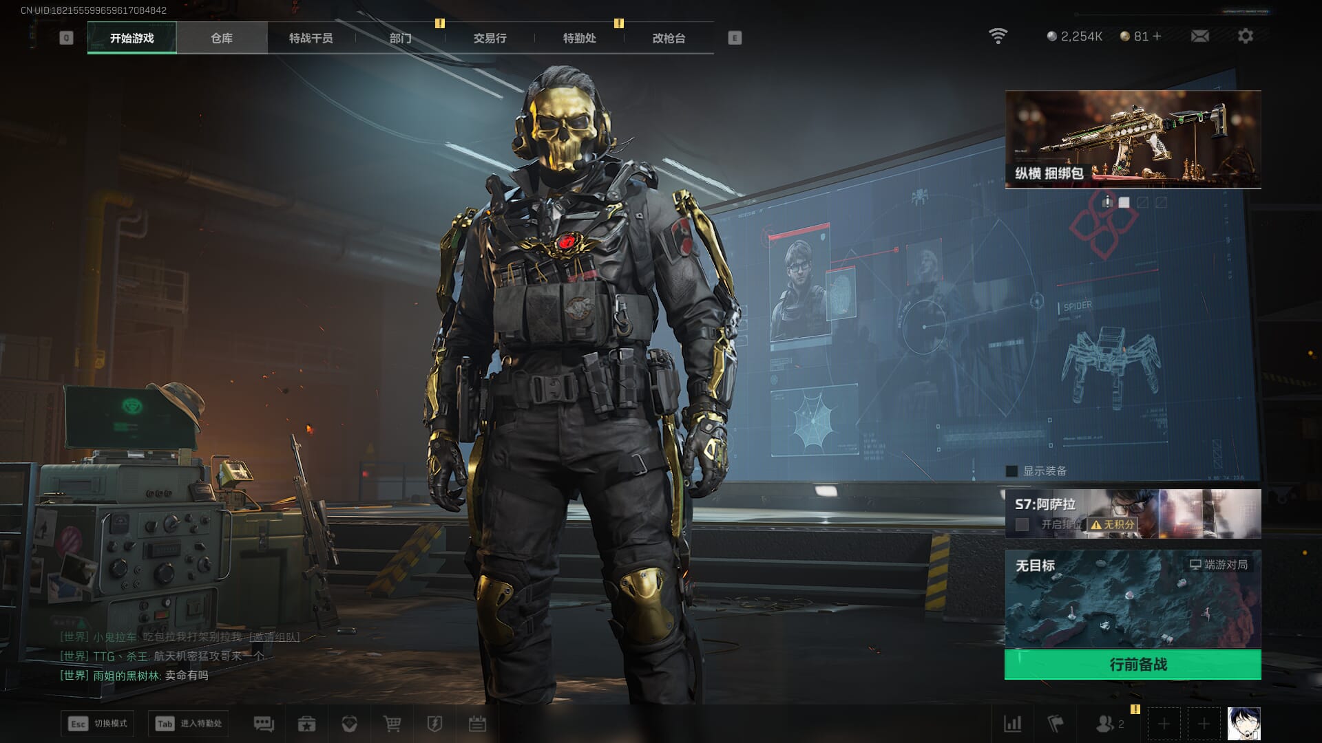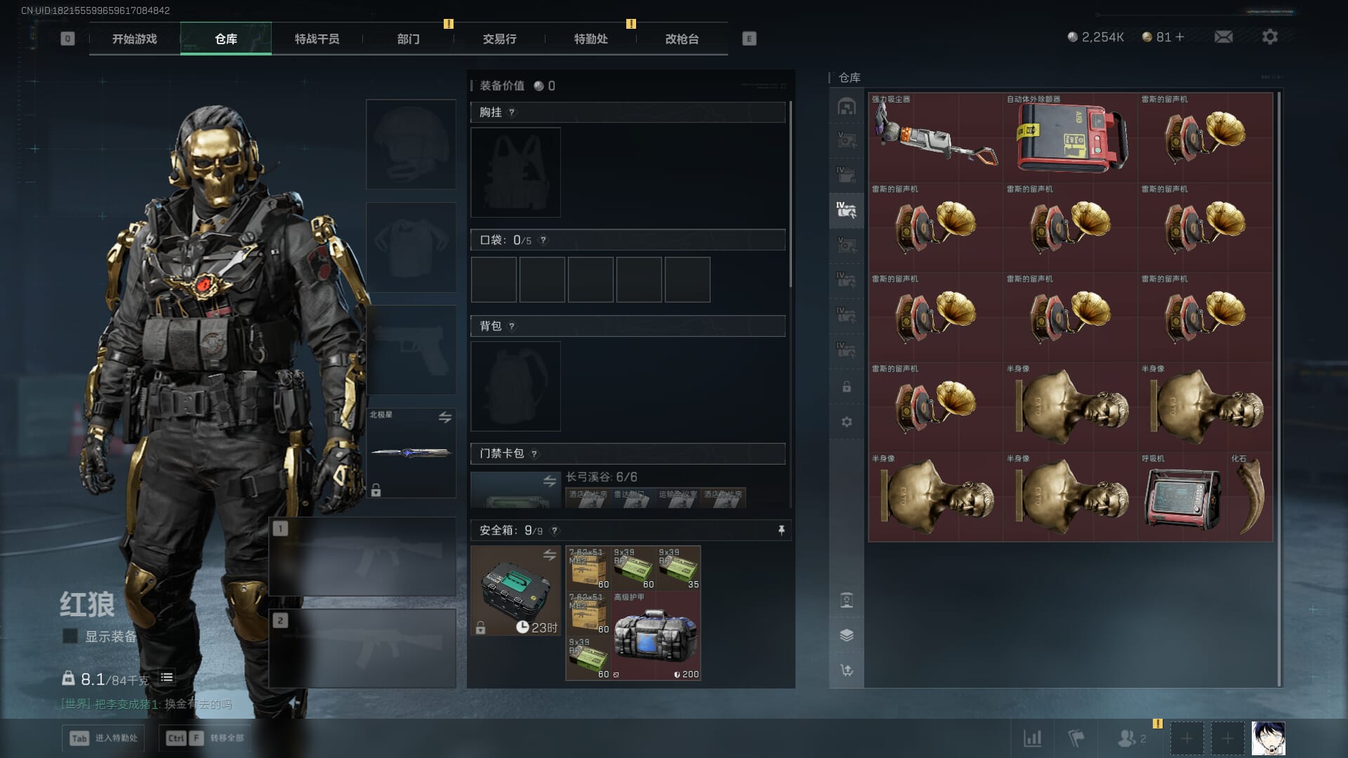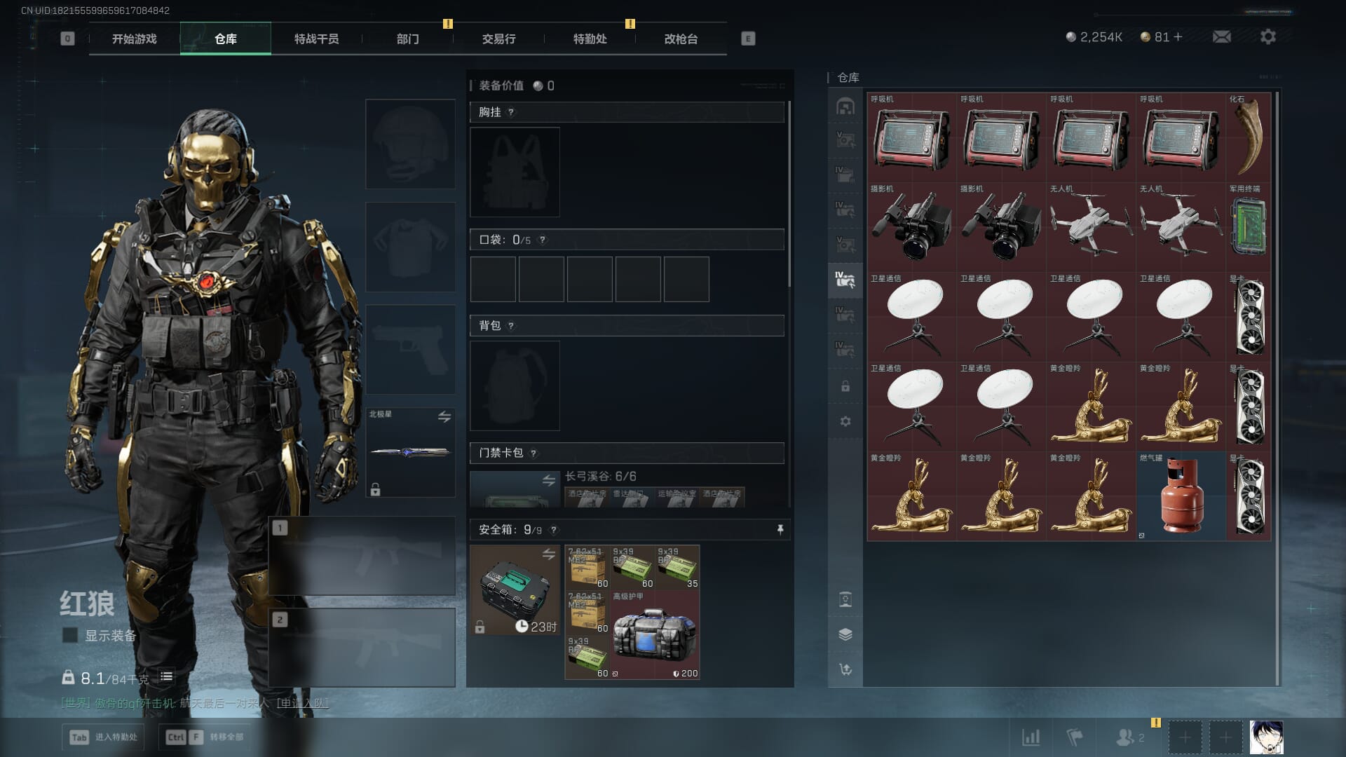 总资产:59.8M,哈夫币:260W,武器皮肤:25,钻石,战场60级:【安全箱】基础安全箱;【特勤处等级】仓库LV.8,靶场LV.7,训练中心LV.7;【干员皮肤】蜂医送葬人无题密令,无名夜鹰,红狼蚀金玫瑰;【近战武器】近战武器-北极星,近战武器-黑鹰;【步枪皮肤】M4A1突击步枪-蚀金玫瑰,M7战斗步枪-神秘艺术,SR-25射手步枪-水墨云图,ASVal突击步枪-蛇年祥瑞,AK-12突击步枪-夜鹰,K437突击步枪-北极星,CAR-15突击步枪-阿米娅,腾龙突击步枪-捞点薯条,AK-12突击步枪-特斯拉线圈,M4A1突击步枪-阿米娅,SCAR-H战斗步枪-启航,KC17突击步枪-电锯惊魂,SG552突击步枪-运动员;【冲锋枪皮肤】P90冲锋枪-神秘艺术,QCQ171冲锋枪-北极星,SMG-45冲锋枪-骑士,UZI冲锋枪-特斯拉线圈,SR-3M紧凑突击步枪-特斯拉线圈,勇士冲锋枪-能天使-午夜邮差;【狙击步枪皮肤】AWM狙击步枪-捞点薯条;【霰弹枪皮肤】725双管霰弹枪-送葬人-无题密令;【轻机枪皮肤】M250通用机枪-骑士之心;【手枪皮肤】93R-捞点薯条;