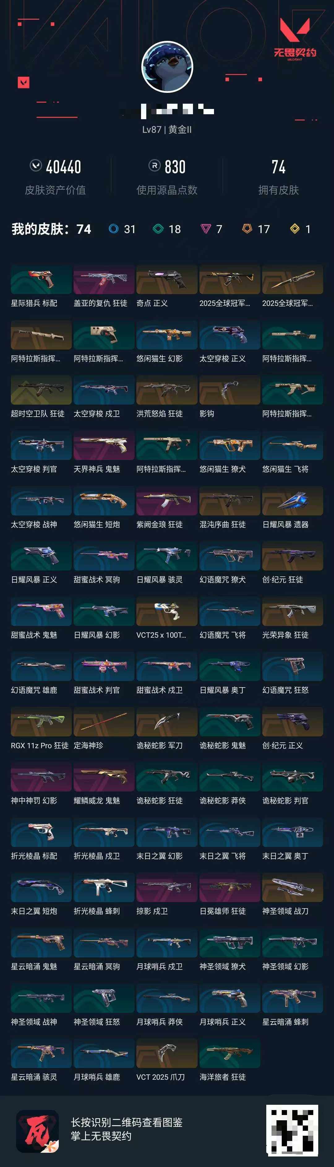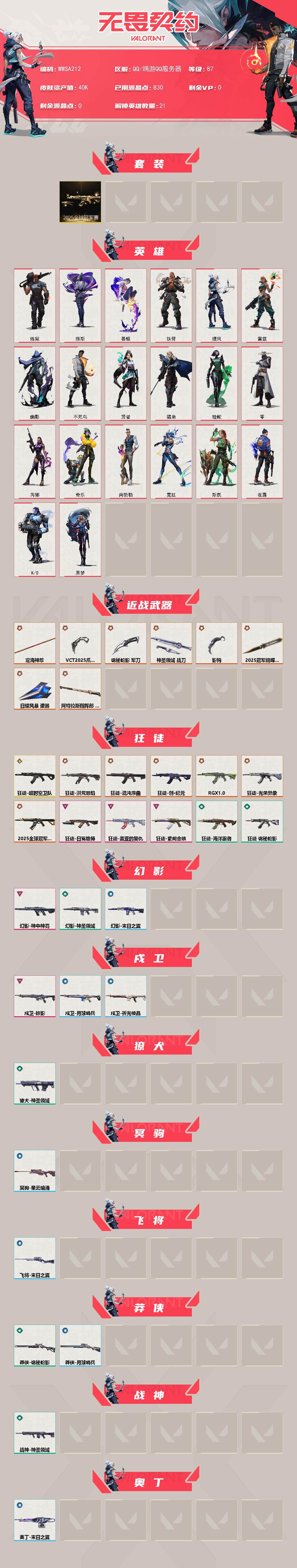 商品描述:【WWSA212】终极*17/传奇*1/卓越*7/皮肤*74/等级*87/段位:黄金/2025全球冠军赛套装/VCT 2025 赛季套装/炼狱/维斯/暮蝶/铁臂/捷风/雷兹/幽影/不死鸟/贤者/猎枭/蝰蛇/零/芮娜/奇乐/尚勃勒/霓虹/斯凯/夜露/K/O/黑梦/近战武器-2025全球冠军赛 蝴蝶刀/近战武器-影钩/近战武器-VCT 2025 爪刀/近战武器-定海神珍/近战武器-诡秘蛇影 军刀/近战武器-神圣领域 战刀/近战武器-日耀风暴 遗器/近战武器-阿特拉斯指挥部 甩棍/狂徒-超时空卫队/狂徒-2025全球冠军赛/狂徒-洪荒怒焰/狂徒-混沌序曲/狂徒-创·纪元/狂徒-RGX 11z Pr