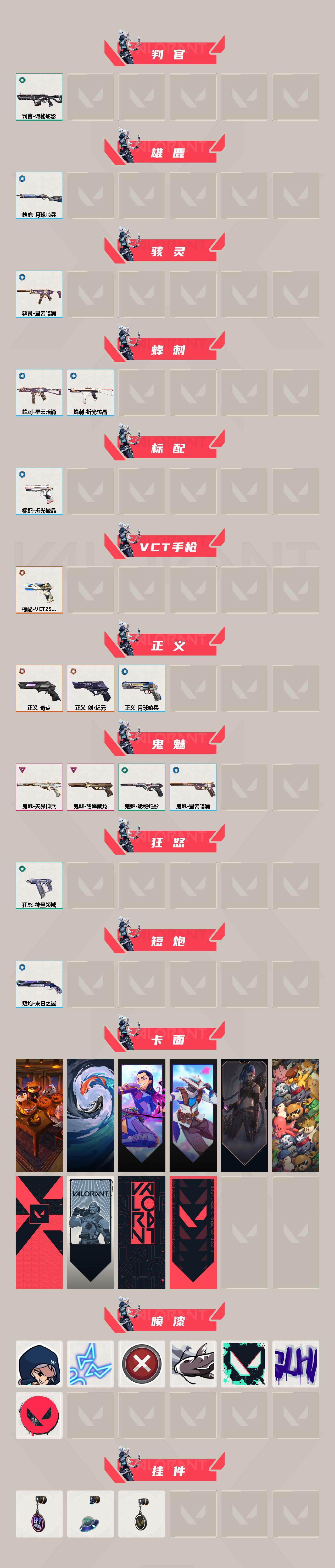 【套装】:2024全球冠军赛套装,2023全球冠军赛套装,《英雄联盟:双城之战》套装,紫阙金琅套装,无畏启程套装【英雄】:幻棱,炼狱,维斯,暮蝶,钛狐,壹决,铁臂,捷风,雷兹,幽影,不死鸟,贤者,猎枭,蝰蛇,零,芮娜,奇乐,尚勃勒,霓虹,斯凯,夜露,星礈,K/O,海神,盖可,黑梦,钢锁【近战 武器】:近战武器-2024全球冠军赛 战刀,近战武器-2023全球冠军赛 苦无,近战武器-合金战车 军刀,近战武器-弧光异彩 军刀,近战武器-金琅斧【狂徒】:狂徒-2023全球冠军赛,狂徒-混沌序曲,狂徒-双城之战,狂徒-RGX 11z Pro,狂徒-掠影,狂徒-紫阙金琅,狂徒-弧光异彩【幻影】
