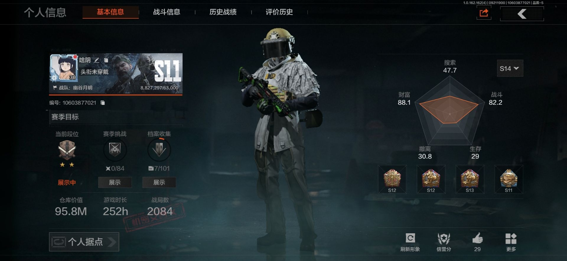 呀16:仓库价值:58.1M 科恩币:400350 4金枪19紫 机密文件DSTW1595安卓Q-等级30-仓库价值555.1k科恩币328864 【套装】 王国卫队礼装 ·轻装 都市夜影套装 台风I竞技运动服 【近战武器】 急袭弯刀 【枪皮】 旗帜·AEK 旧王圣谕·QBZ191 冬夜·AK12 利齿风暴·MPX 旧王圣谕·VSS 骑士之剑·VSS 冰河碎影·14