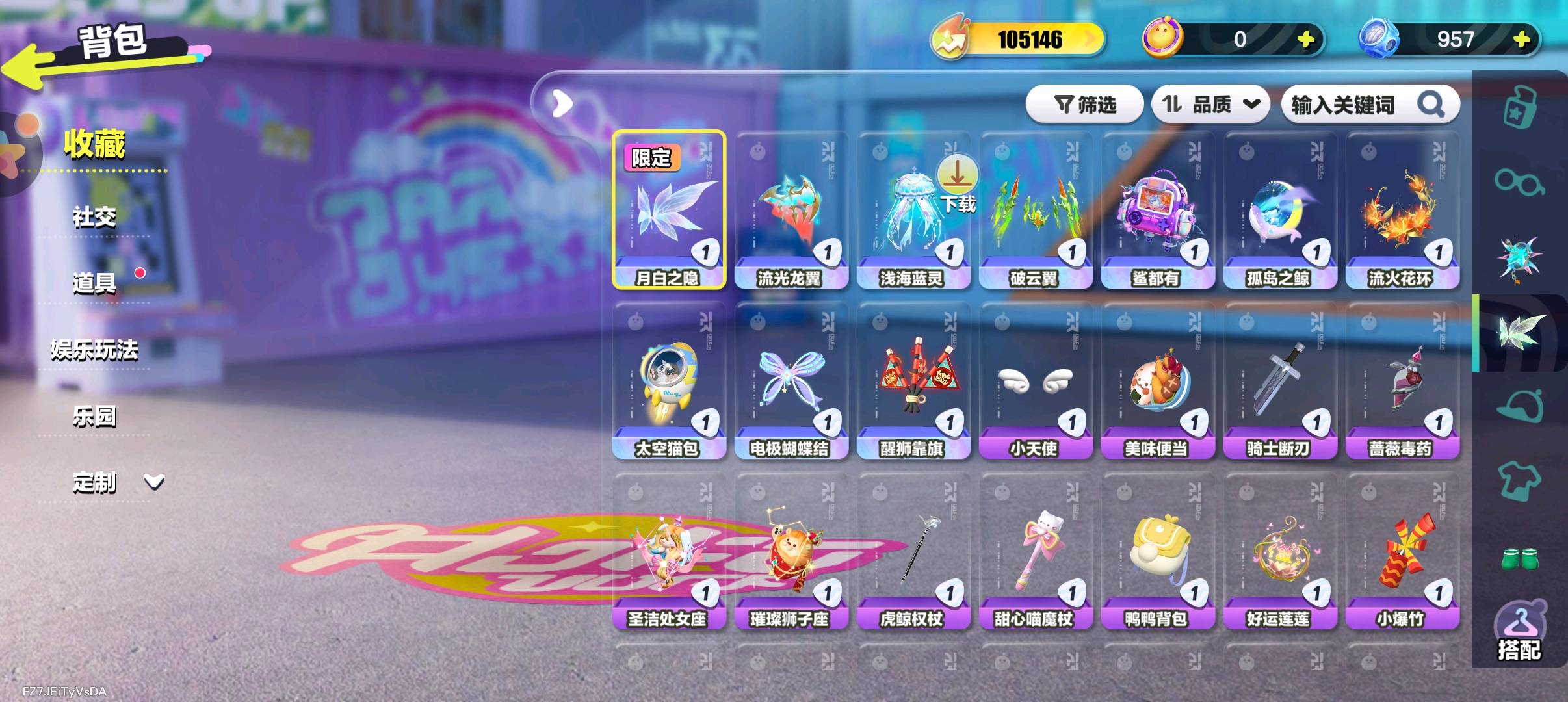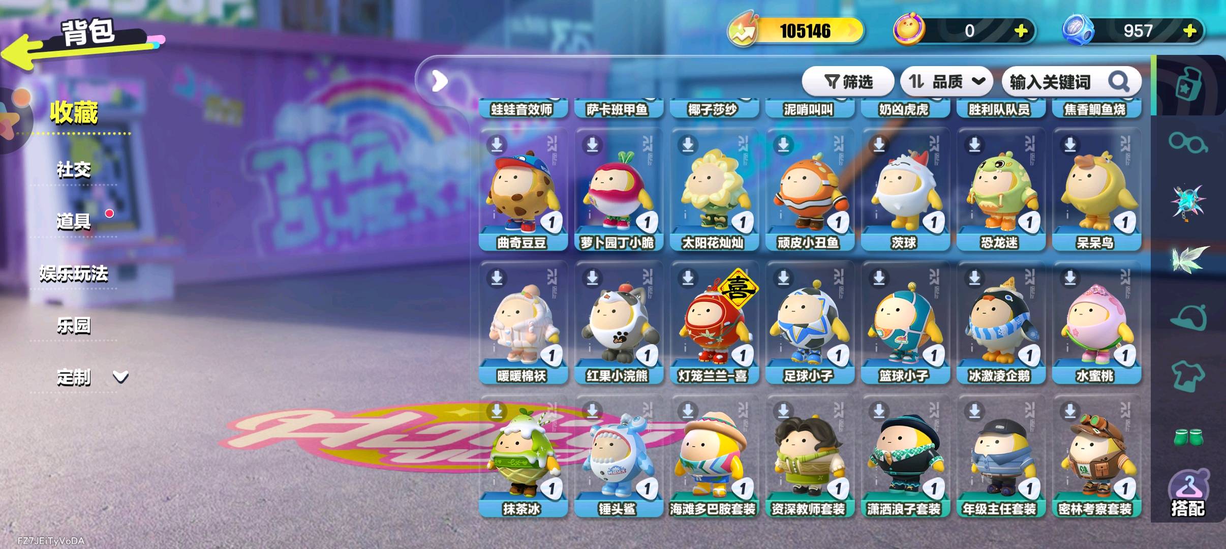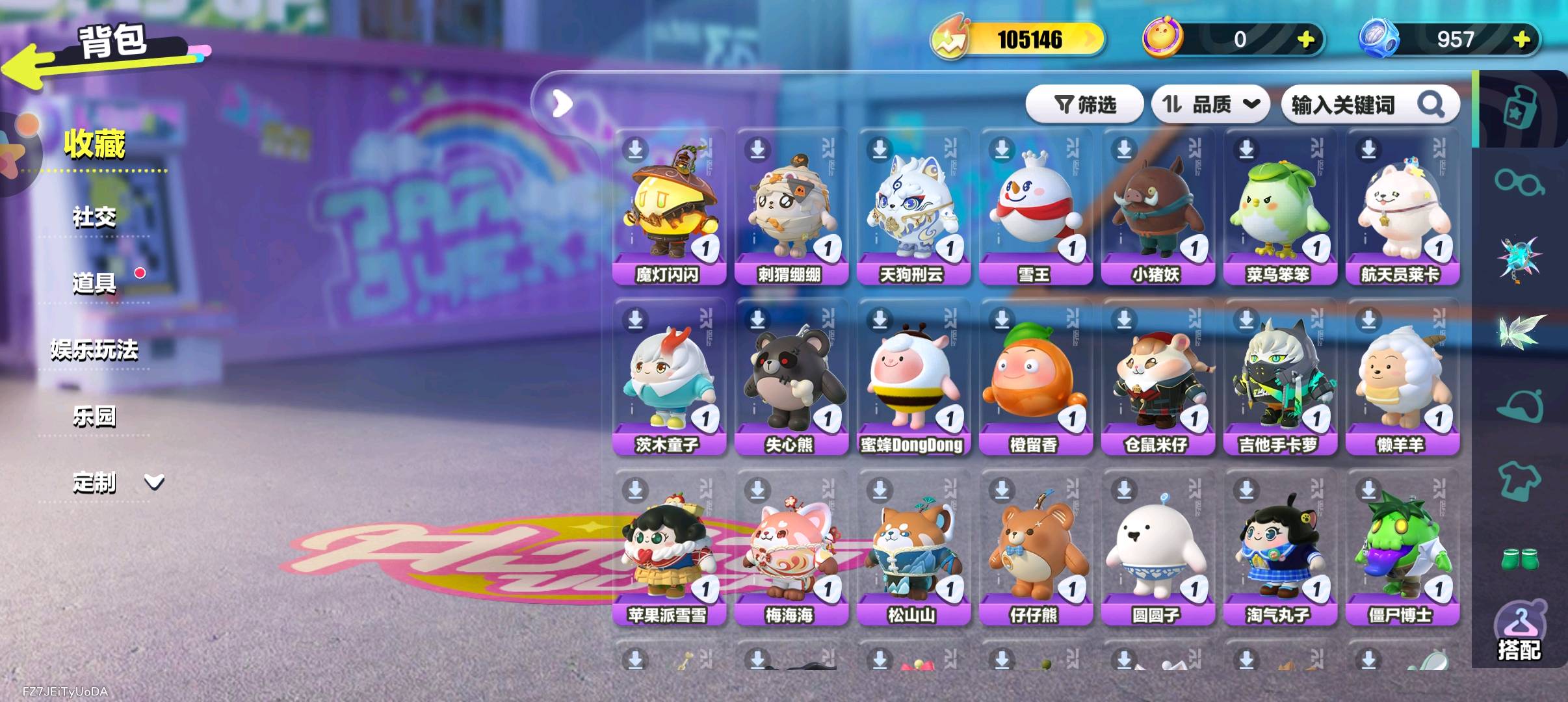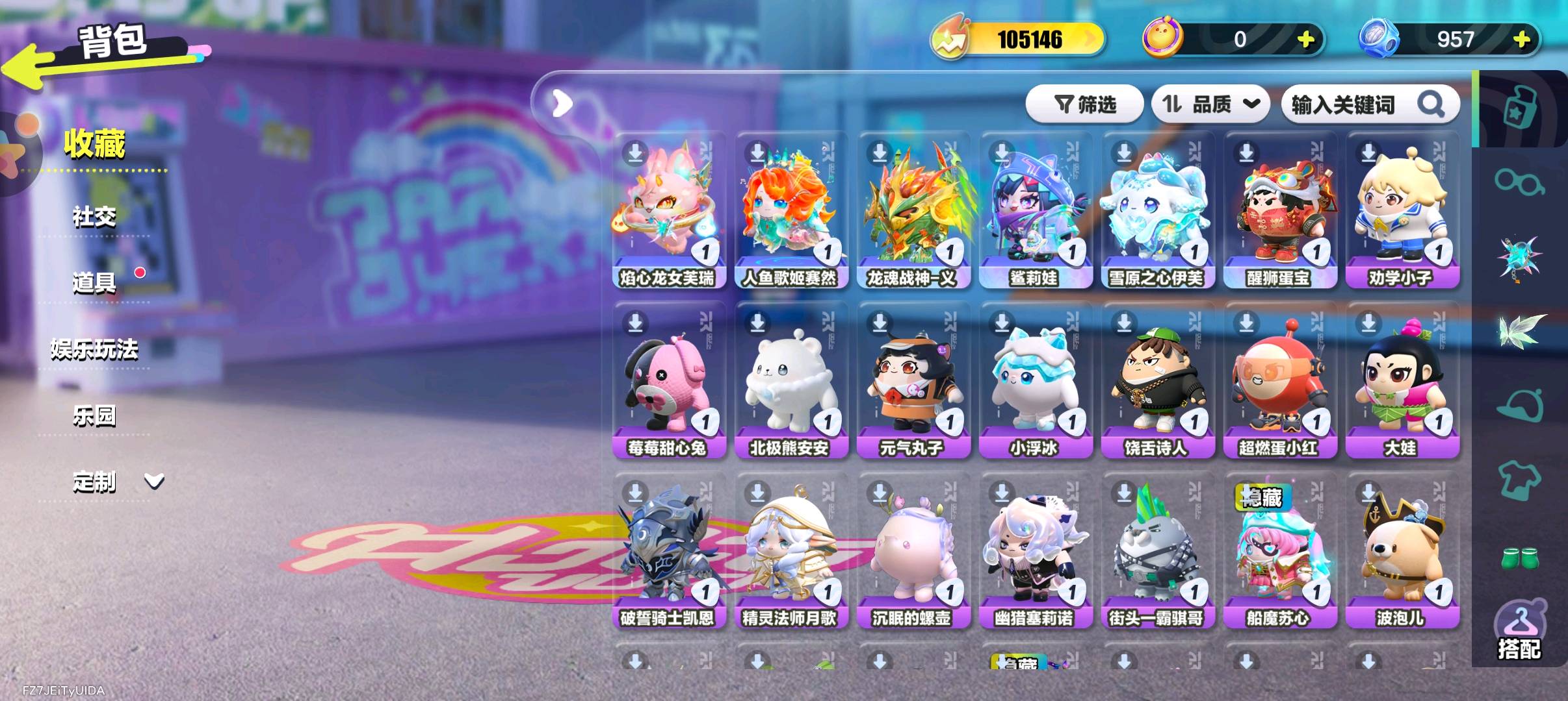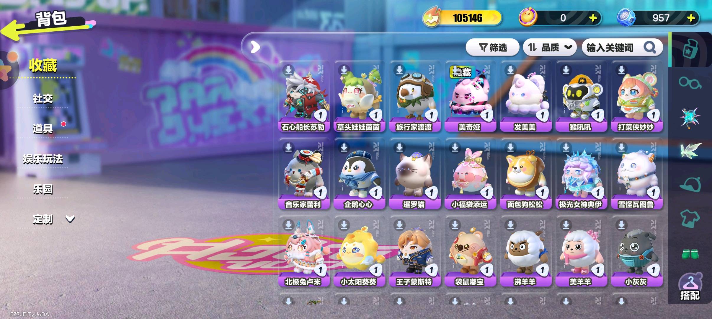 天穹骑士-湛 精灵莉斯尔 圣翼天使-恋 紫色套装: 小太阳葵葵 海藻偷偷 狸猫大力 航天员莱卡 仓鼠米仔 豚豚服务员 饶舌诗人 魔灯闪闪 雪王 菜鸟笨笨 三角龙小萨 失心熊 云村音音 八音盒温妮 水母尤莱亚 水母莱莱 机械鼓手贝克 吉他手卡萝 蓝樱爱丽丝 菠萝苏苏 仔仔熊 DongDong 甜心猫萝拉 哞哞 淘气丸子