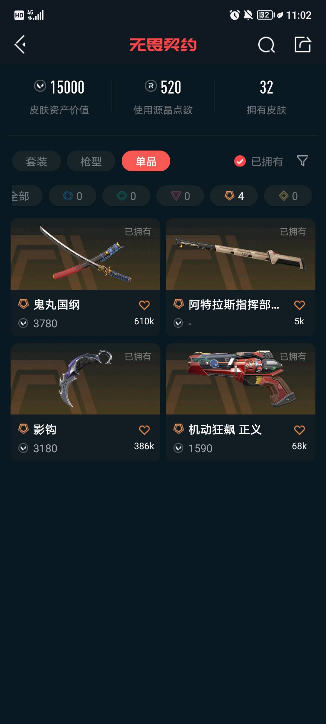 SH62 皮肤总价值33270,未定级,总皮肤73,刀皮6枪皮67(传奇10卓越9),套装2(传奇1卓越1),具体详情看图