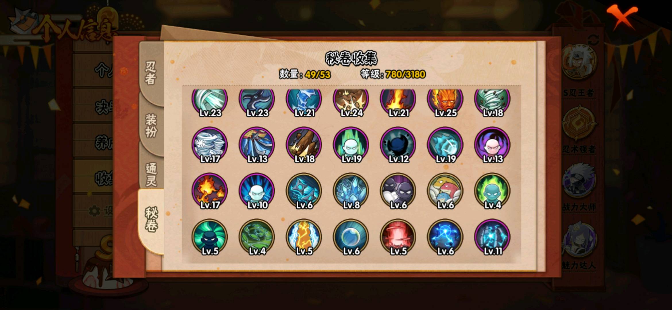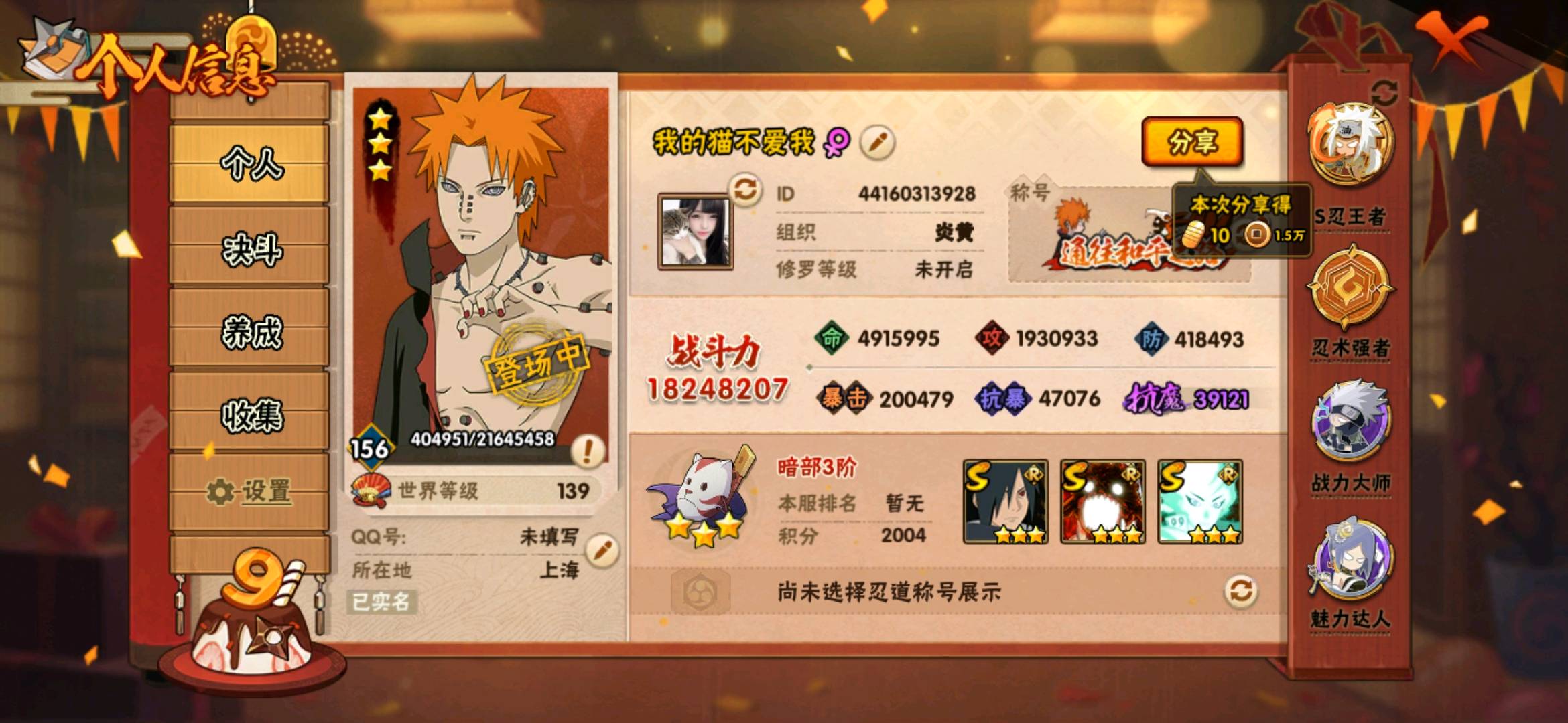 苹果Q309区:可二次实名 VIP13,战力:13070313,S忍者数量:39,A忍者数量:58,本服排名:187,战区排名:未上榜,通灵兽数量:22,时装数:18,段位:暗部1阶,忍者星数:68711s❤20A佩恩 「天道」;大蛇丸;千手扉间;纲手;自来也;千手柱间;长门 「秽土转生」;艾 「四