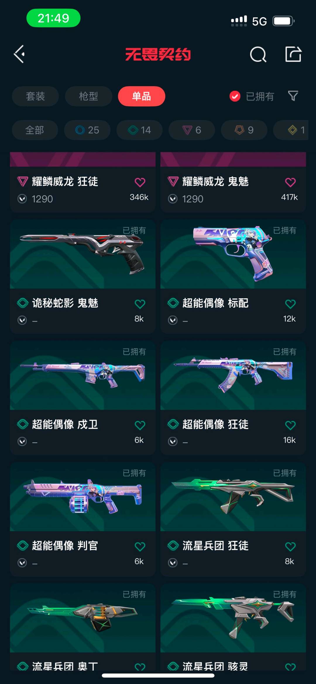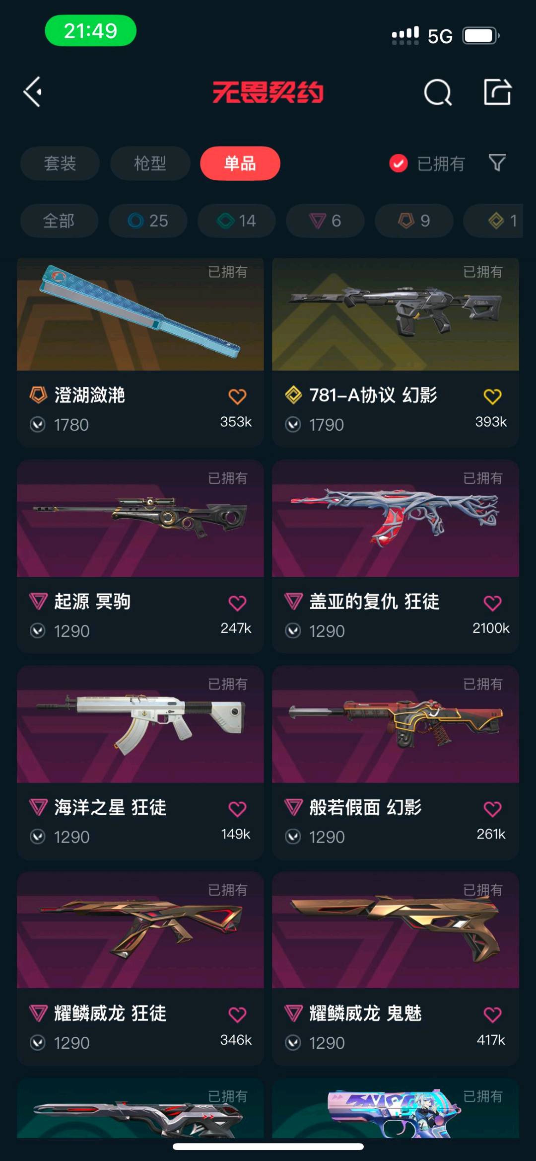 SH51 Lv149 ,未定级,英雄25,皮肤138,卡面134,喷漆143,挂件104,混沌序曲套装,千灵华绽套装,塑水宗套装,机动狂飙套装,光明哨兵2.0套装,归零者套装,具体详情看图SH63;Lv88 ,皮肤总价值29010,铂金I,总皮肤49,刀皮5枪皮44(终极1传奇6卓越6),套装1(传奇1),具体详情看图
