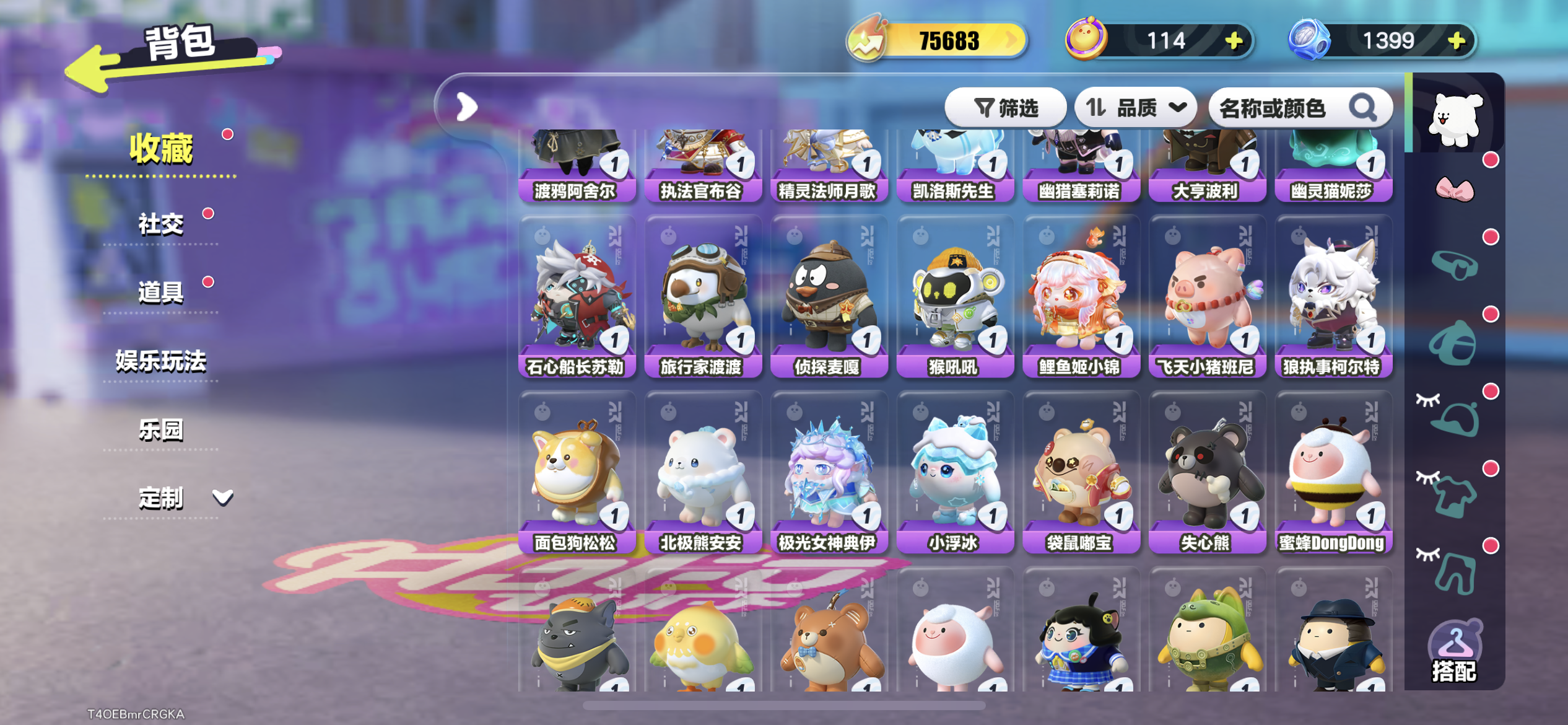 天穹骑士-湛 精灵莉斯尔 圣翼天使-恋 紫色套装: 小太阳葵葵 海藻偷偷 狸猫大力 航天员莱卡 仓鼠米仔 豚豚服务员 饶舌诗人 魔灯闪闪 雪王 菜鸟笨笨 三角龙小萨 失心熊 云村音音 八音盒温妮 水母尤莱亚 水母莱莱 机械鼓手贝克 吉他手卡萝 蓝樱爱丽丝 菠萝苏苏 仔仔熊 DongDong 甜心猫萝拉 哞哞 淘气丸子