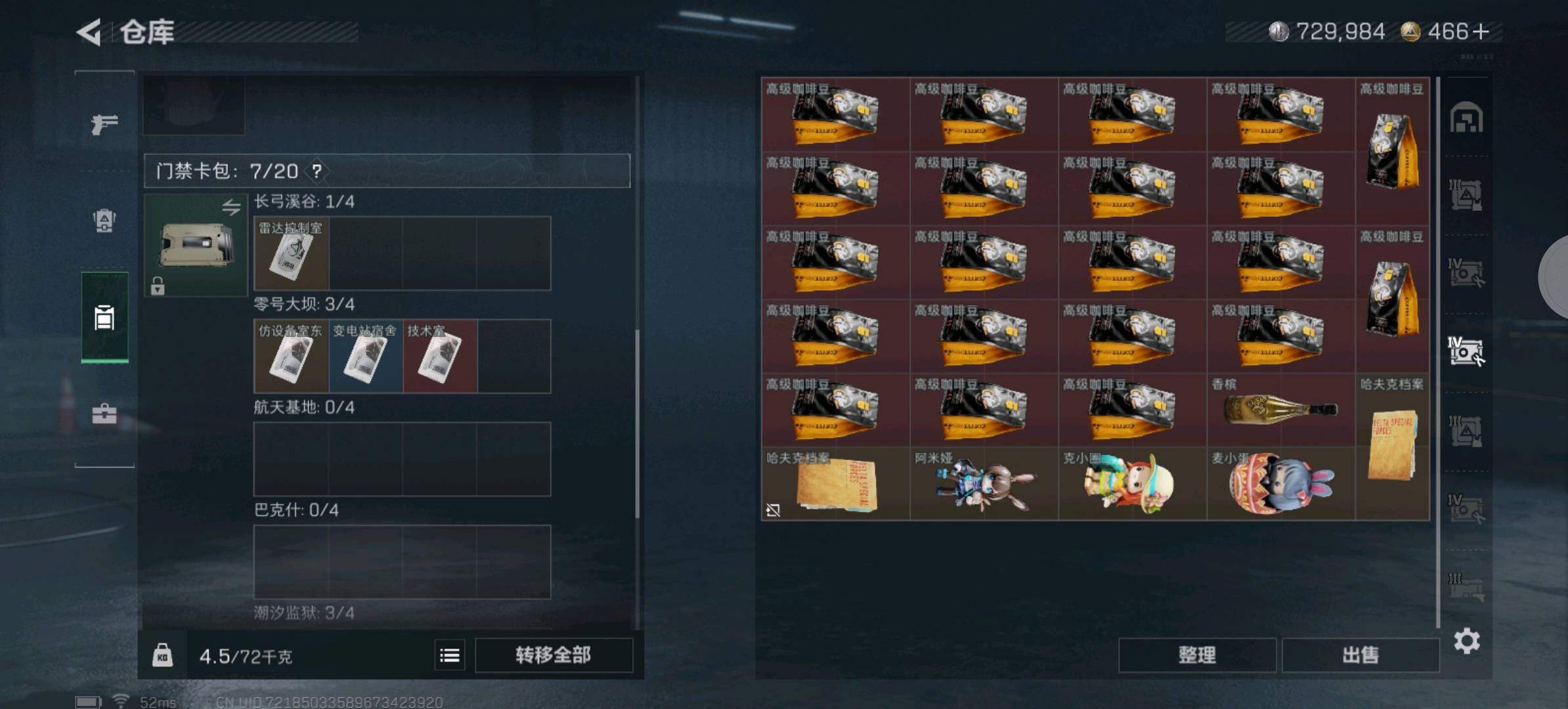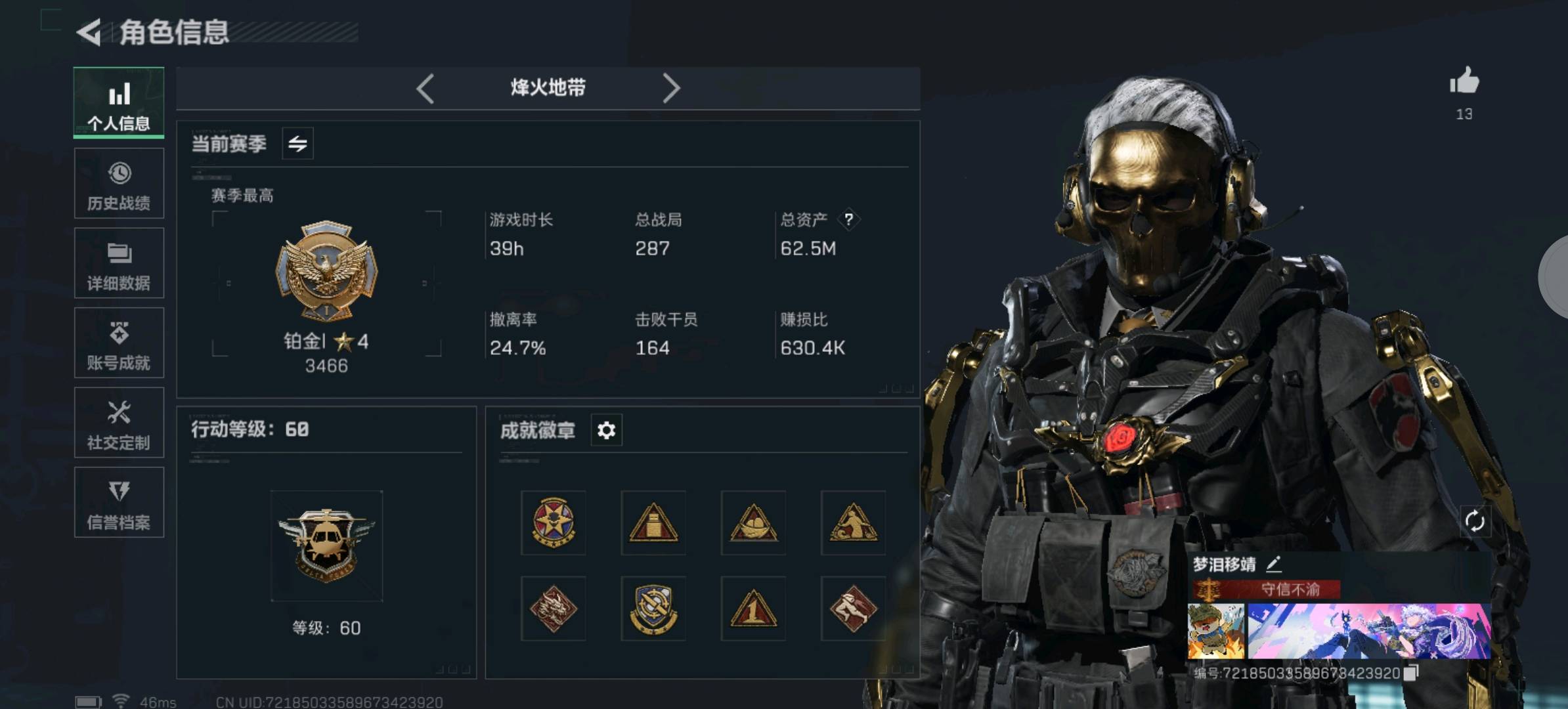 SH2581 总资产386M,哈夫币10117w,非洲之心,枪皮数量243,战场等级:37 上等兵,行动等级:60 铂金,角色皮肤数量7,红狼-蚀金玫瑰/骇爪-水墨云图/牧羊人-街头之王/威龙-铁面判官/威龙-壮志凌云/威龙-蛟龙特战队/无名-夜鹰,近战-黑海/近战-影锋/近战-怜悯/近战-赤枭/近战-黑鹰,Vector冲锋枪-美杜莎(优品C),安全箱等时效性道具请以游戏内数据为准;详情请看图