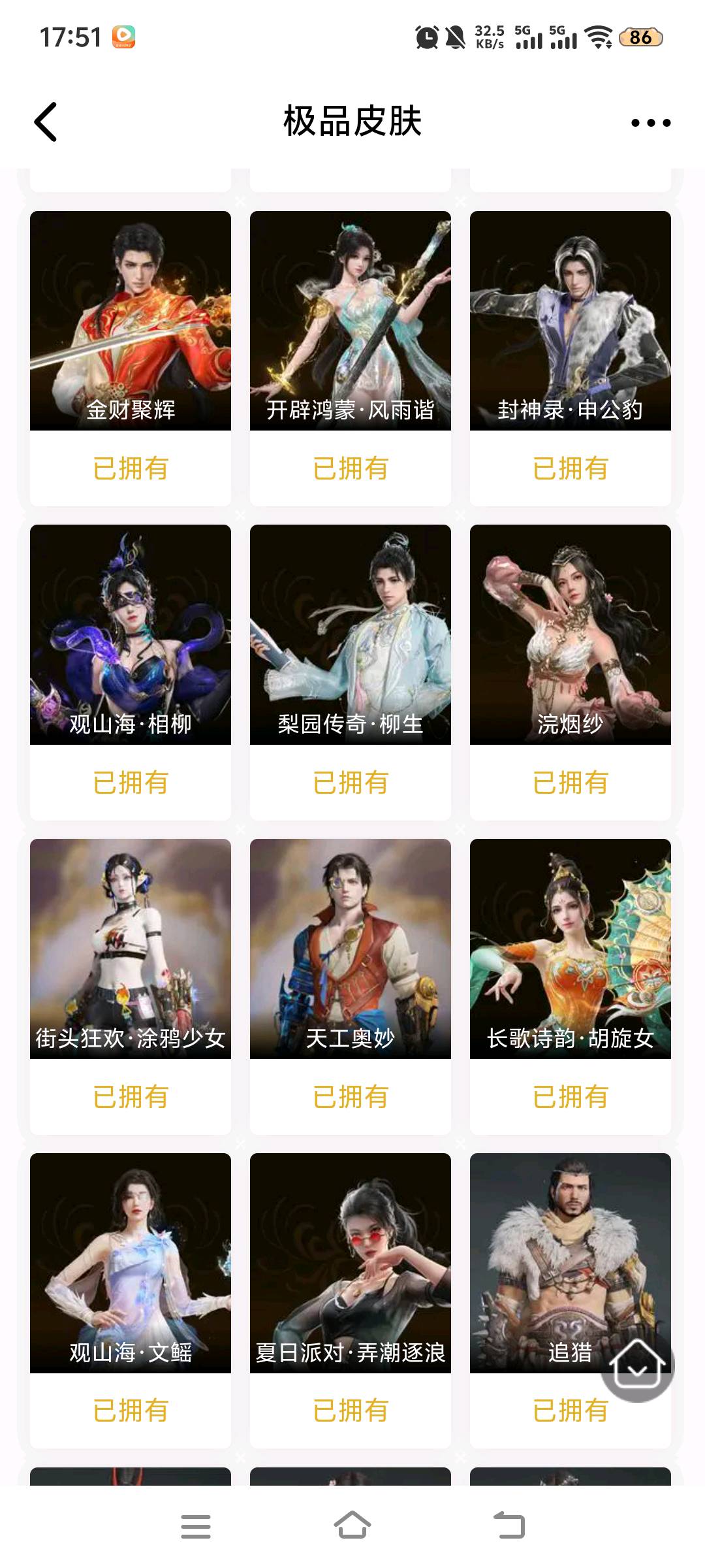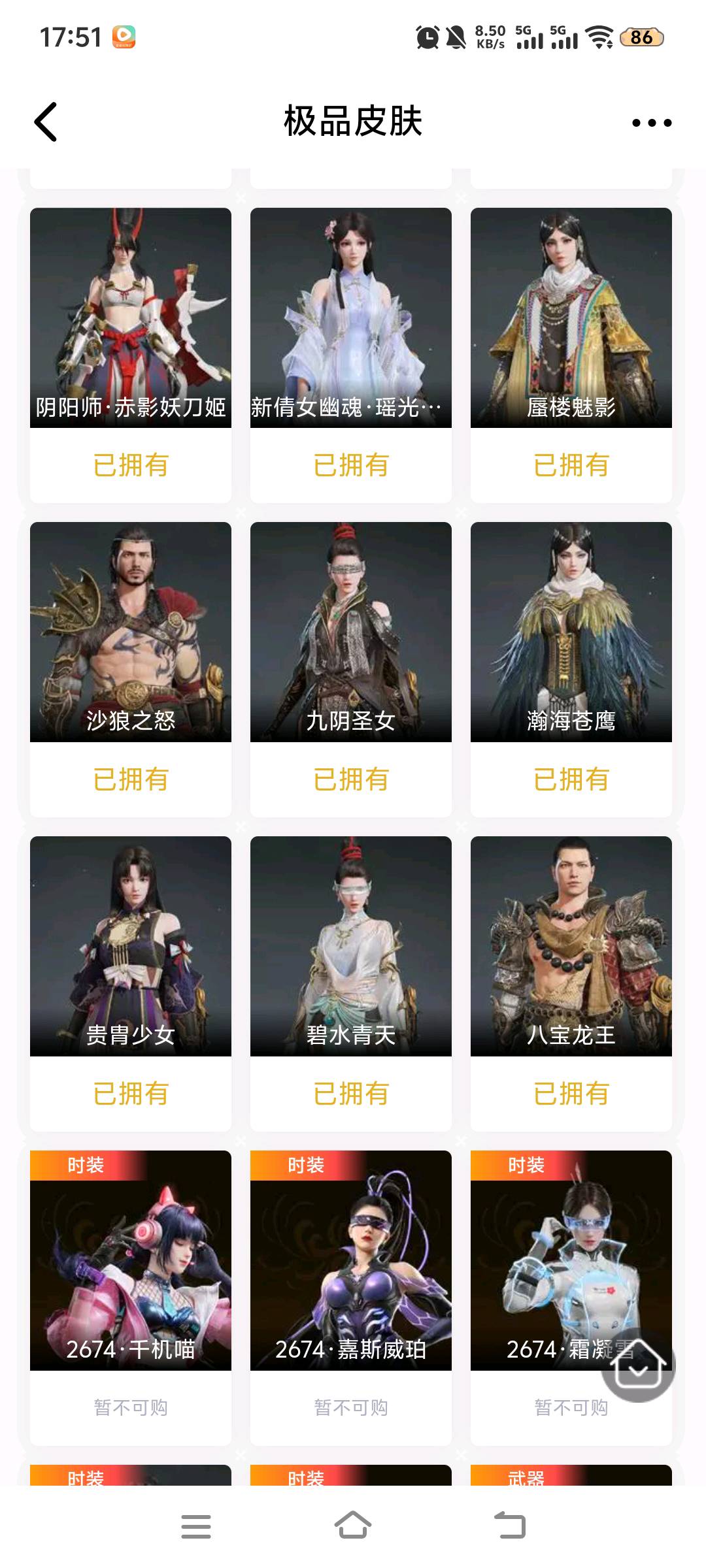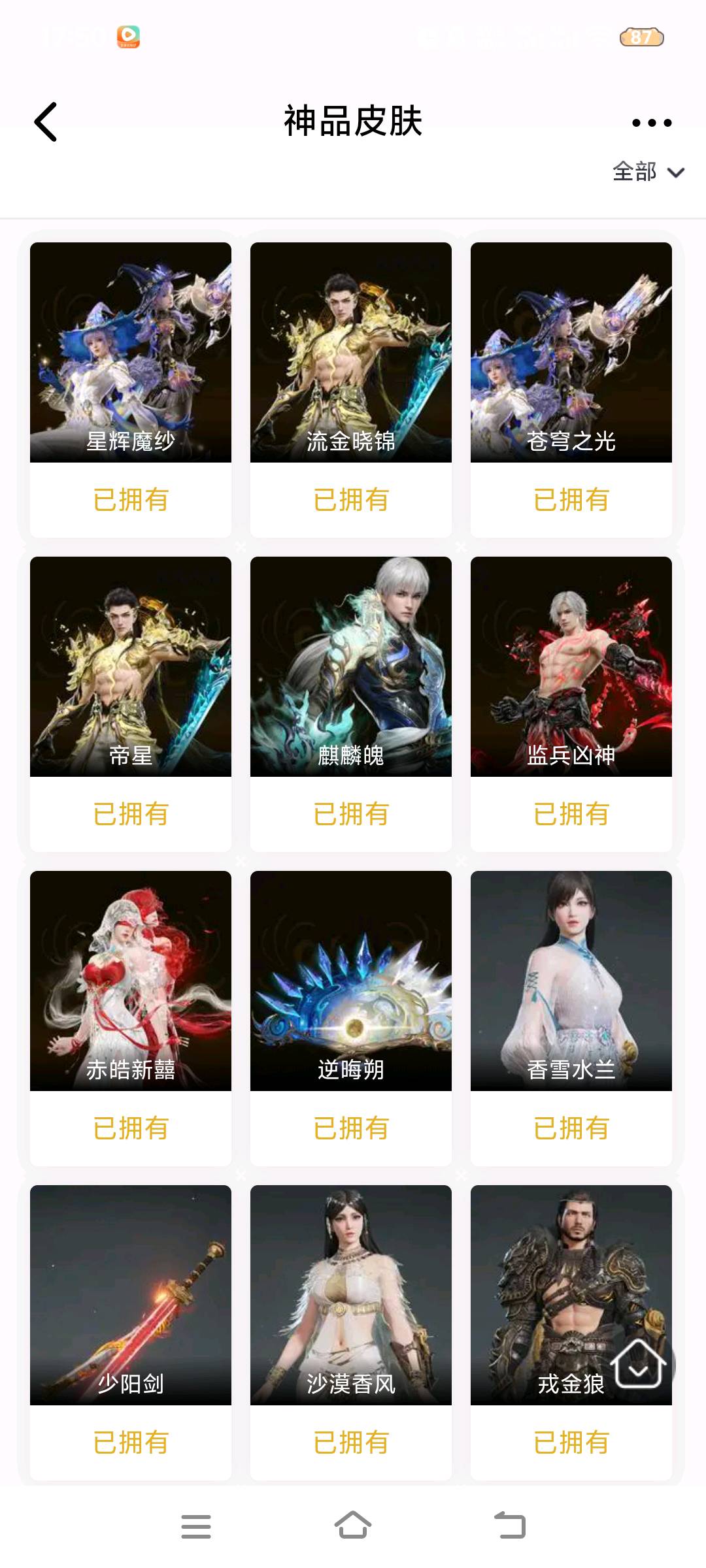 MYJ85网易官服等级:142 5红皮11金皮 【红皮】 监兵凶神(胡为皮肤) 少阳剑(长剑皮肤) 狼主(阔刀皮肤) 化生明王(天海皮肤) 蝶梦(胡桃皮肤) 【金皮】 斗罗大陆·唐三 封神录·申公豹 封神录·姜子牙 梨园传奇·柳生 浣烟纱 追猎 御宅罗梦 麟鹿大凯 贵胄少女 伏波龙女 碧水青天