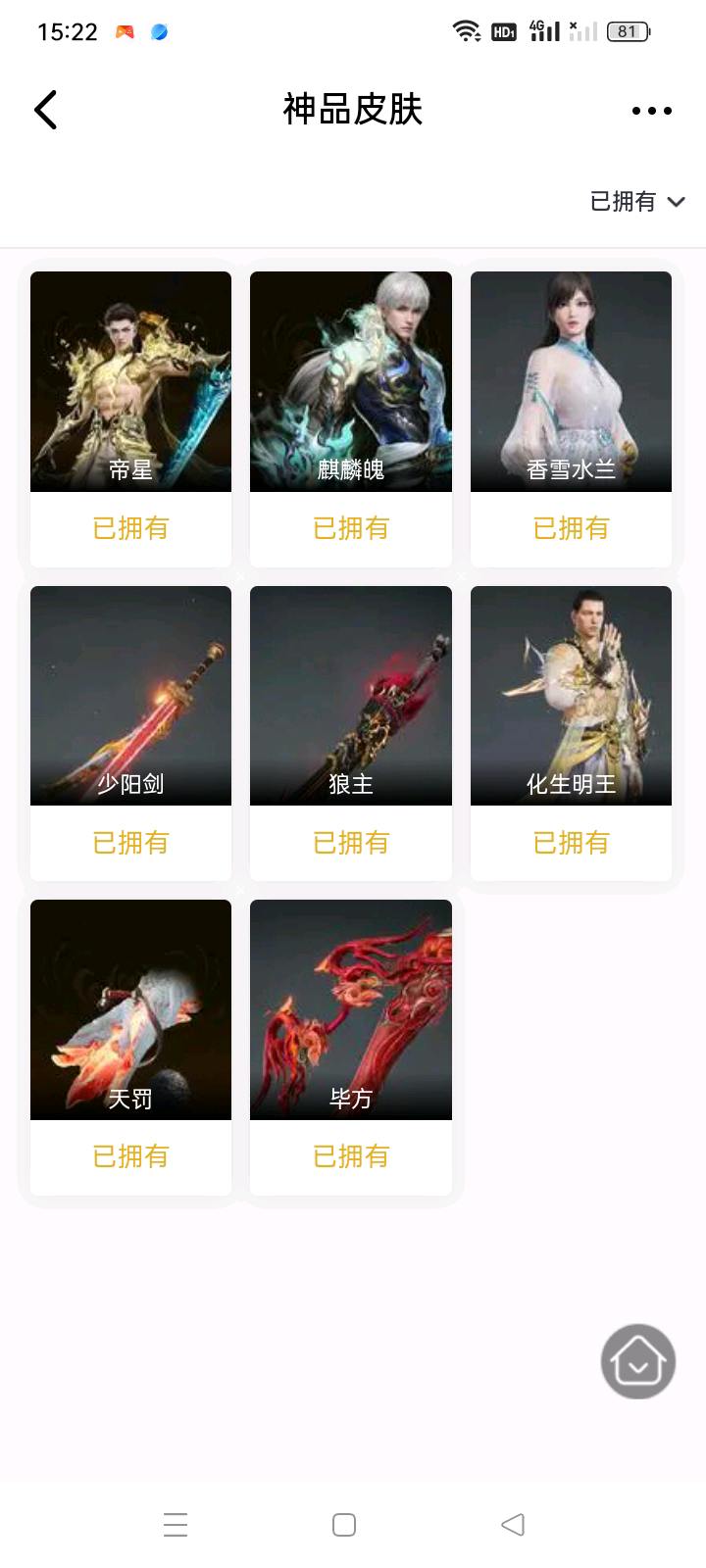 MYJ85网易官服等级:142 5红皮11金皮 【红皮】 监兵凶神(胡为皮肤) 少阳剑(长剑皮肤) 狼主(阔刀皮肤) 化生明王(天海皮肤) 蝶梦(胡桃皮肤) 【金皮】 斗罗大陆·唐三 封神录·申公豹 封神录·姜子牙 梨园传奇·柳生 浣烟纱 追猎 御宅罗梦 麟鹿大凯 贵胄少女 伏波龙女 碧水青天