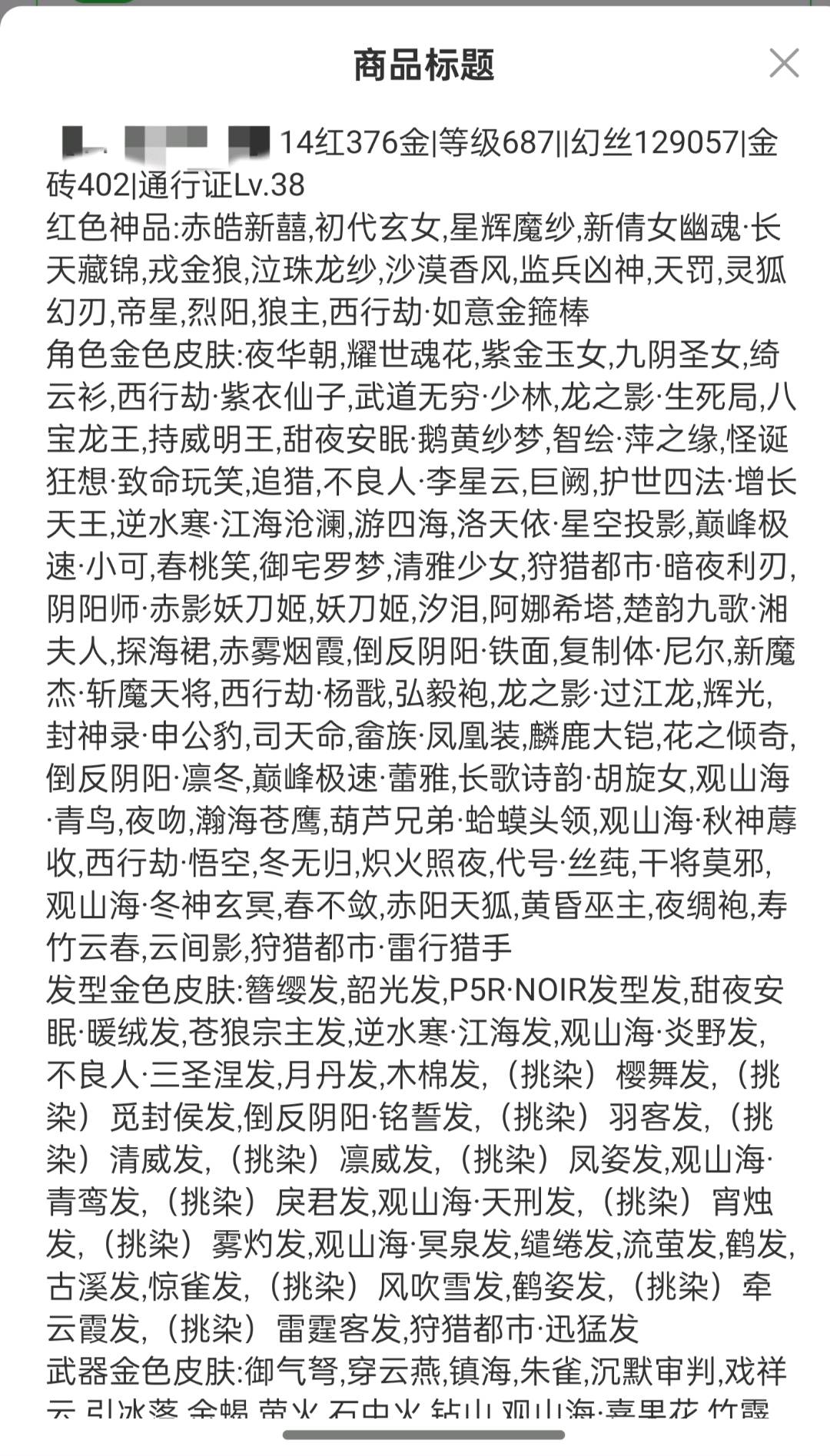 [8565404]精品18红皮号悍虎斩+精武魂+炎烈珠+赛季外观任选礼一个!!!18红531金 【网易邮箱】 红皮: 初代玄女(宁红叶皮肤),戎金狼(特木尔皮肤),绝代风华(迦南皮肤),沙漠香风(迦南皮肤),熛怒炼火(季沧海皮肤),蝶梦(胡桃皮肤),青龙将星(岳山皮肤),香雪水兰(顾清寒皮肤),狼主(阔刀皮肤),少阳剑(长剑皮肤),化生明王(天海皮肤),泣珠龙纱(崔三娘皮肤),涯角(枪皮肤),飞将戟(斩马刀皮肤),星辉魔纱(沈妙皮肤),悍虎斩(斩马刀皮肤) 收藏值:338740幻丝:15008 精品服饰及变身器奥义:龙之影·精武魂+自动人形·A2+2674·千机喵+夏日派对·半夏晚风+御祥云+炎烈珠+灵狐耳 段位因赛季原因发生变化,以上号为准,头像、发饰、挂饰、魂玉及其他皮肤请看截图[11967343]超绝性价比带妹小号!灵狐幻刃!狼主!可二次!H10032 【神品皮肤】7 墨离 香雪水兰 戎金狼 灵狐幻刃、狼主、绝代风华、初代玄女【龙之道】宁红夜.自知