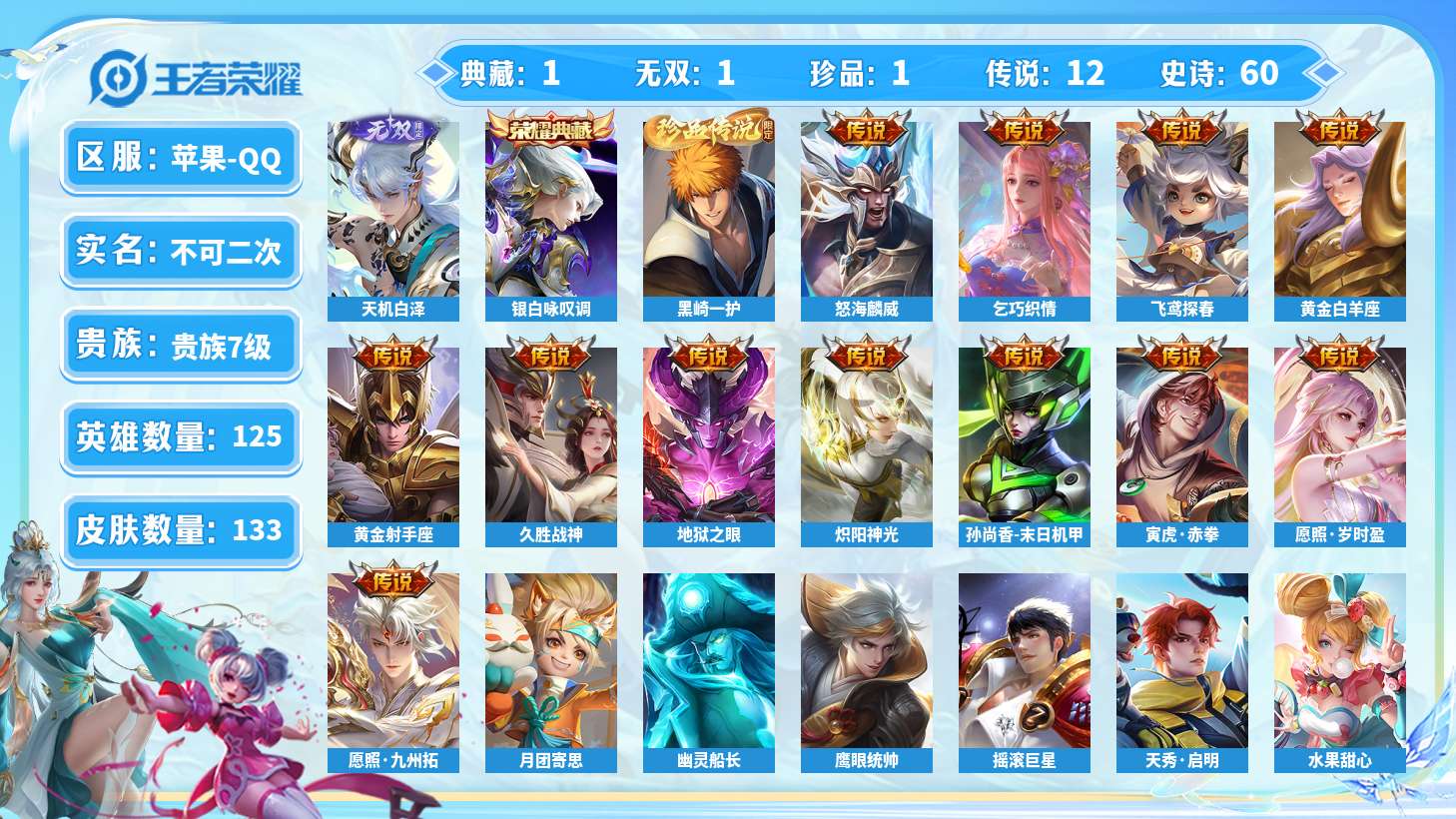 【王者荣耀】【LYWZ22431】珍品无双0 典藏1 无双1 珍品传说1 传说12 史诗45 英雄125 皮肤133 贵族7级 荣耀典藏:银白咏叹调__无双皮肤:天机白泽__珍品传说:黑崎一护__传说皮肤:炽阳神光|地狱之眼|久胜战神|黄金射手座|黄金白羊座|飞鸢探春|乞巧织情|孙尚香-末日机甲|怒海麟威|寅虎·赤拳|愿照·岁时盈|愿照·九州拓__稀有限定:至尊宝|海滩派对|皇家上将|黎明之约|魔术师|探海日志|阴阳师|优雅恋人|驭风魔法|云间偶戏|缤纷独角兽|冰冠公主|乘风破浪|地狱岩魂|电玩小子|鬼剑武藏|黄金分割率|节奏热浪|金属风暴|魅力维加斯|魅语|女仆咖啡|圣诞狂欢|水果甜心|天秀·启明|摇滚巨星|鹰眼统帅|幽灵船长|月团寄思|噬灭天穹|东方月初|孙尚香-时之恋人|舞动绿茵|特工魅影|心灵骇客|茶境仙|谧流熔炉|化蝶舞|流音漫舞|访茗客|苍威无极|刘禅-鸭鸭历险记|沈梦溪-鸭鸭历险记|藏狐·褐绒|龙之律动|布丁狗之约|虚灵犬护|石田雨龙|逆浪荇歌|孙策-百相守梦|周瑜-百相守梦|黄忠-百相守梦|涂山容容|光弋星穹|往忆晖光|百里玄策-罗小黑战记|荣光之誓|万灵启世|巫礼祀神|鹤鸣心笺__优质皮肤:创世神祝|年年有余|激情绿茵|维京掠夺者|启蛰|生化警戒|第七人偶|芝加哥教父|占星师|灼热之刃|精准探案法|丁香结|坚韧之力|幻乐之宴|功夫老勺|幻想奇妙夜|兔女郎|死亡骑士|黄金武士|少女阿狸|天使之翼|玩偶对对碰|红桃皇后|零食大作战|牛运亨通|危途狂花|潮玩牛仔|紫罗兰之誓|铁甲之心|重装意志|拳王|救世之瞳|魅影绮裳|西施-雪境奇遇|金福满堂|星梦巡礼|灵卦秘语|爆裂喵拳|景韶洛都|掌控之力|雾都夜雨|逐霄战戟|铁骨偃魂|纽约教父|乱世虎臣|苍林狼骑|春野闲踪|灵野札记|玫蓝誓约|命运加冕|潮玩士官长|小满鸭|死霸装|踏浪烽翎|落日弦歌|克喵|青衿临川|哪吒-罗小黑战记__贵族等级:贵族7级__王者段位:至尊星耀天机白泽,银白咏叹调,黑崎一护,寅虎·赤拳,黄金射手座,炽阳神光,愿照·九州拓,愿照·岁时盈,怒海麟威,至尊宝等热门限定皮肤