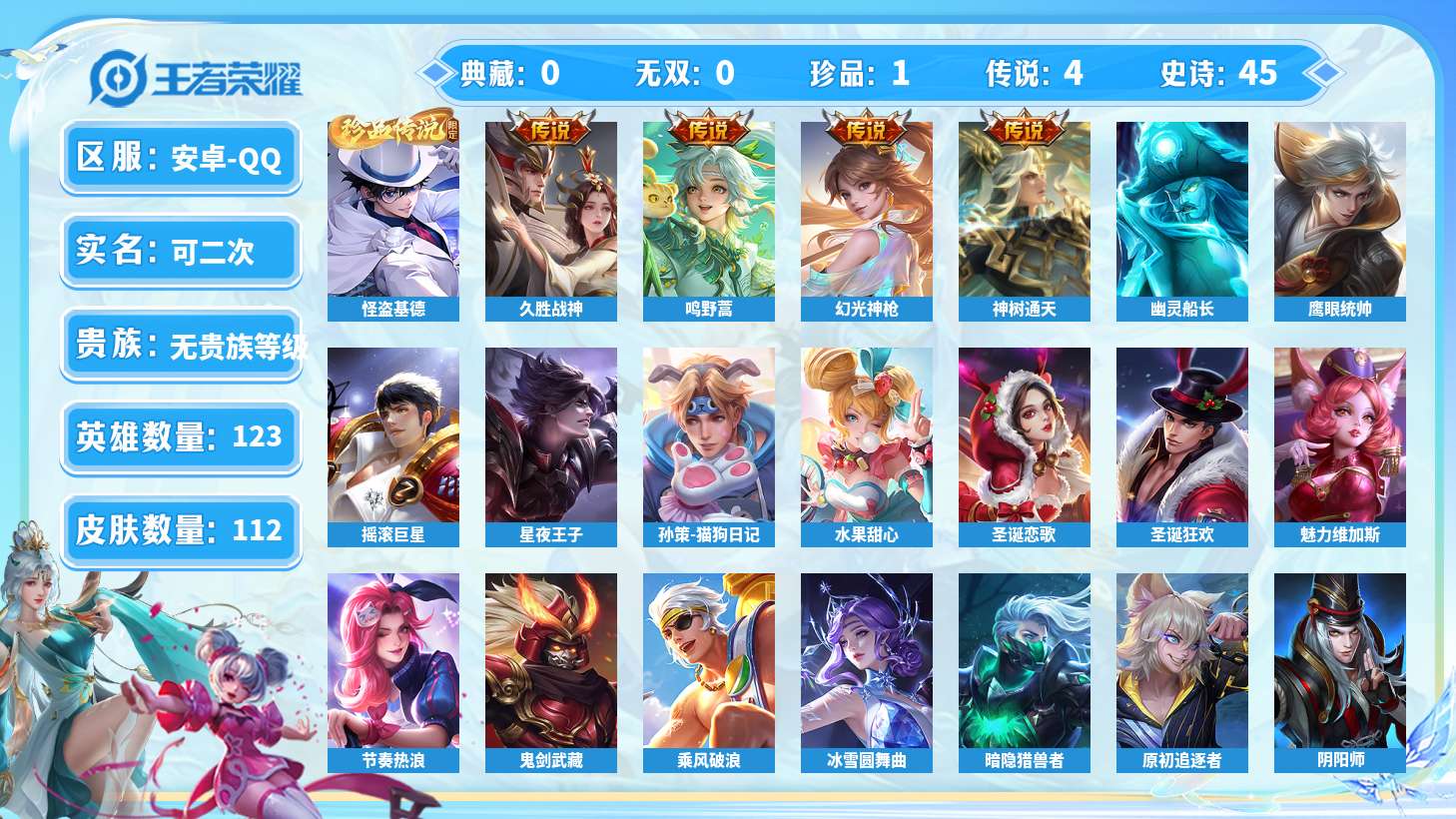 【王者荣耀】【LYWZ22422】珍品无双0 典藏0 无双0 珍品传说1 传说4 史诗23 英雄123 皮肤112 贵族0级 珍品传说:怪盗基德__传说皮肤:鸣野蒿|久胜战神|幻光神枪|神树通天__稀有限定:李小龙|大漠名商|古海寻踪|海盐诗旅|胡桃夹子|剑破天穹|江河有灵|金庭之子|千军破阵|沙漠行僧|探海日志|醍醐杖|天穹祈灯|万华元夜|演武夺筹|疑决卦|阴阳师|原初追逐者|暗隐猎兽者|冰雪圆舞曲|乘风破浪|鬼剑武藏|节奏热浪|魅力维加斯|圣诞狂欢|圣诞恋歌|水果甜心|孙策-猫狗日记|星夜王子|摇滚巨星|鹰眼统帅|幽灵船长|逐浪之夏|噬灭天穹|顽岩魄|天穹之誓|舞动绿茵|特工魅影|心灵骇客|星界战将|谧流熔炉|原初探秘者|云中旅人|荣光之誓|鹤鸣心笺__优质皮肤:孤猎|露花倒影|激情绿茵|碧珀绯影|超能战警|踏雪寻梅|启蛰|潮流仙人|芝加哥教父|街头旋风|绝影神枪|地府判官|赤焰之缨|特种部队|范海辛|星航指挥官|龙域领主|极冰防御线|阿摩司公爵|破阵·退雄兵|潮玩探月行|次元突破|鲨炮海盗猫|野性能量|丁香结|守护之力|功夫老勺|命运角斗场|幻想奇妙夜|海滩丽影|阿尔法小队|兔女郎|死亡骑士|黄金武士|街头霸王|教廷特使|危途狂花|白执事|西施-雪境奇遇|掌控之力|雾都夜雨|铁骨偃魂|龙腾万里|敏锐之力|孙悟空-西部大镖客|龙舞盛年|乓乓大师|蒙犽-归虚梦演|曜-归虚梦演|沉稳之力|程咬金-群星魔术团|完美运算|花好人间|熔金海岸|春野之旅|苍林狼骑|蔚蓝守将|劲辣红锅|特工战影|炽热元素使|妄想特派|哪吒-罗小黑战记__贵族等级:无贵族等级__王者段位:至尊星耀【怪盗基德】