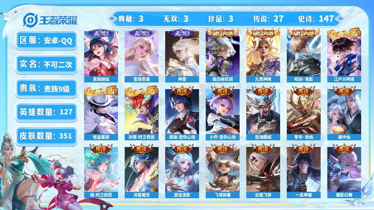 【王者荣耀】【LYWZ22424】珍品无双0 典藏3 无双3 珍品传说3 传说28 史诗106 英雄127 皮肤351 贵族9级 荣耀典藏:银白咏叹调|九霄神辉|鸣剑·曳影__无双皮肤:真我赫兹|雪境奇遇|神罪__珍品传说:江户川柯南|怪盗基德|孙策-时之奇旅__传说皮肤:鸣野蒿|音你闪耀|炽阳神光|启明星使|胖达荣荣|地狱之眼|地狱火|黄金狮子座|黄金白羊座|猫影幻舞|一念神魔|云鹰飞将|飞鸢探春|游龙清影|淬星耀世|瑶-时之祈愿|画中仙|孙尚香-末日机甲|零号·赤焰|怒海麟威|小乔-音你心动|周瑜-音你心动|山海·炽霜斩|映山客|万灵伏威|神树通天|纵目迁山__稀有限定:飞衡|神威|傲雪梅枪|狮舞东方|拒霜思|暗影游猎|百解令|百木心枪|冰锋战神|大漠名商|地狱燃心|高山流水|古海寻踪|海滩派对|海盐诗旅|胡桃夹子|幻夜卜梦|皇家上将|混沌棋|火炮绅士|剑破天穹|江河有灵|金庭之子|迷踪丽影|魔术师|女武神|奇幻香踪|千军破阵|擒涛扼浪|青焰无极|驱傩正仪|燃音魔法|沙漠行僧|探海日志|天穹祈灯|万华元夜|妄想食味|无心|五谷丰年|午后时光|纤云弄巧|星界游侠|演武夺筹|夜都怪侠|疑决卦|阴阳师|吟游魔法|驭风魔法|遇见飞天|云间偶戏|暗夜贵公子|暗隐猎兽者|白蛇|缤纷独角兽|冰冠公主|冰雪圆舞曲|乘风破浪|大乔-猫狗日记|德古拉伯爵|地狱岩魂|电玩·爆裂旋风|电玩小子|伽罗-琥珀纪元|功夫厨神|鬼剑武藏|黄金分割率|箭羽风息|节奏热浪|金属风暴|李元芳-蔬乡物语|吕布-末日机甲|魅力维加斯|魅语|女仆咖啡|偶像歌手|青蛇|赏金猎手|上官婉儿-群星魔术团|绅士熊喵|圣诞狂欢|圣诞恋歌|诗语江南|鲁班七号-蔬乡物语|水果甜心|水晶猎龙者|孙策-猫狗日记|滕王阁序|天才门将|晚萤|赵云-未来纪元|嘻哈天王|星夜王子|雪上飞焰|摇滚巨星|鹰眼统帅|幽灵船长|遇见神鹿|月团寄思|云中君-时之祈愿|逐浪之夏|紫霞仙子|赵怀真-鹤归松栖|百里守约-百相守梦|老夫子-百相守梦|陌上桑|谪仙醉月|噬灭天穹|敬我三分|炽弈燎原|撼地雄心|破空之剑|战舞者|东方月初|涂山红红|霜北刀|顽岩魄|蔡文姬-夏日便利店|虞姬-夏日便利店|天穹之誓|怒海争锋|修罗|曙光守护者|心灵战警|千年之狐|孙尚香-时之恋人|无限星赏官|舞动绿茵|特工魅影|心灵骇客|茶境仙|谧流熔炉|云中旅人|玲珑珍味|孙悟空-神迹守卫|流音漫舞|访茗客|暖冬·兔眠|灵卜魔法|苍威无极|落雪兰心|龙之律动|光弋星穹|往忆晖光|荣光之誓|万灵启世|巫礼祀神|鹤鸣心笺__优质皮肤:尼罗河女神|一千零一夜|创世神祝|年年有余|埃及法老|孤猎|木偶奇遇记|熊喵少女|午夜歌剧院|露花倒影|激情绿茵|碧珀绯影|秩序猎龙将|锦衣卫|冰刃幻境|森|超能战警|英喵野望|维京掠夺者|海军大将|绯红之刃|踏雪寻梅|启蛰|画中游|威尼斯狂欢|第七人偶|潮流仙人|芝加哥教父|绝影神枪|地府判官|荷鲁斯之眼|幸存者|赤焰之缨|福禄兄弟|隐刃|前尘|特种部队|精灵王|剑舞者|范海辛|星航指挥官|龙域领主|爱与和平|占星师|花间舞|魇语军师|极冰防御线|花见巫女|棒球奇才|东海龙王|蔷薇王座|灼热之刃|精准探案法|圣殿之光|帝国元帅|霓裳曲|阿摩司公爵|精灵公主|修竹墨客|万圣前夜|怪诞之夜|动物派对|长夏之忆|破阵·退雄兵|异域游侠|暗都幽影|功夫炙烤|暖冬絮语|幻夜行动|聚星闪耀|潮玩探月行|虎啸剑宗|瓷语鉴心|秘密基地|次元突破|鲨炮海盗猫|野性能量|丁香结|虹云星官|守护之力|坚韧之力|幻乐之宴|功夫老勺|命运角斗场|幻想奇妙夜|海滩丽影|阿尔法小队|兔女郎|死亡骑士|黄金武士|少女阿狸|天使之翼|玩偶对对碰|宫本武藏-未来纪元|红桃皇后|忍·炎影|街头霸王|教廷特使|鸿运当头|金色潮汐|漠中幻影|时空谍影|决胜大满贯|破局者|王牌新星|零食大作战|西部游侠|乐园追猎者|牛运亨通|潮玩造梦师|危途狂花|契约魔法|次元傲视|黑桃队长|幽兰居士|拳王|时尚教父|白色死神|白执事|大发明家|哥特玫瑰|西施-雪境奇遇|星梦巡礼|缤纷绘卷|掌控之力|雾都夜雨|逐霄战戟|铁骨偃魂|纽约教父|龙腾万里|乱世虎臣|经纬探寻者|敏锐之力|西施-归虚梦演|孙悟空-西部大镖客|鲁班大师-归虚梦演|热血海滩|龙舞盛年|汉昭烈帝|乓乓大师|五福同心|盾山-圆桌骑士|蒙犽-归虚梦演|万事如意|曜-归虚梦演|唤灵魔甲|太乙真人-圆桌骑士|沉稳之力|程咬金-群星魔术团|完美运算|化身博士|花好人间|熔金海岸|春野之旅|无尽旅途|潮玩骑兵|苍林狼骑|蔚蓝守将|劲辣红锅|特工战影|炽热元素使|妄想特派|无双福将|径山谋武|逐霄之志__贵族等级:贵族9级__王者段位:荣耀王者【精品v9】【3无双3典藏3珍品28传说皮肤】【柯南基德天幕+43按键】