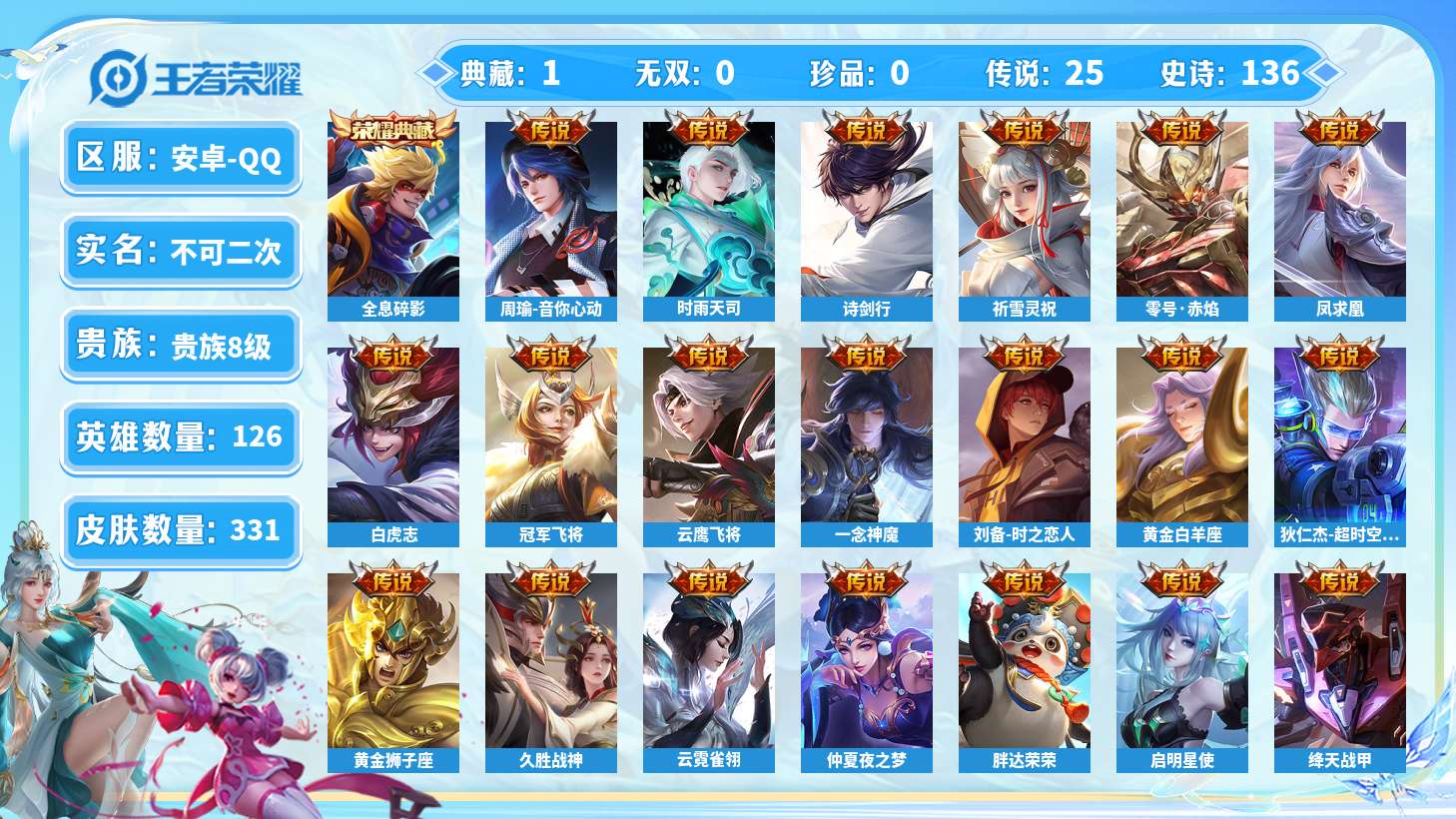 【王者荣耀】【LYWZ22434】珍品无双0 典藏1 无双0 珍品传说0 传说25 史诗92 英雄126 皮肤331 贵族8级 荣耀典藏:全息碎影__传说皮肤:鸣野蒿|枫霜尽|前尘镜|绛天战甲|启明星使|胖达荣荣|仲夏夜之梦|云霓雀翎|久胜战神|黄金狮子座|狄仁杰-超时空战士|黄金白羊座|刘备-时之恋人|一念神魔|云鹰飞将|冠军飞将|白虎志|凤求凰|零号·赤焰|祈雪灵祝|诗剑行|时雨天司|周瑜-音你心动|幻光神枪|神树通天__稀有限定:奔雷神使|御风骁将|朱雀志|飞衡|蔷薇恋人|神威|孙行者|猪悟能|傲雪梅枪|李小龙|梁祝|狮舞东方|拒霜思|百解令|冰锋战神|冰霜恋舞曲|大漠名商|电玩高手|繁星吟游|高山流水|古海寻踪|海滩派对|海盐诗旅|航海奇遇记|胡桃夹子|胡桃异想国|幻夜卜梦|皇家上将|混沌棋|火炮绅士|剑破天穹|江河有灵|金庭之子|狂想玩偶喵|黎明之约|美猴王|魔术师|匿光决锋者|千军破阵|擒涛扼浪|驱傩正仪|沙漠行僧|朔风刀|探海日志|醍醐杖|天狼溯光者|天穹祈灯|玩趣恶龙|万华元夜|妄想食味|无心|五谷丰年|午后时光|纤云弄巧|星空之诺|驯魔猎人|演武夺筹|夜都怪侠|疑决卦|阴阳师|吟游魔法|银河之约|遇见飞天|御旌|御銮|云间偶戏|逐梦之光|逐梦之星|逐梦之影|暗夜猫娘|暗隐猎兽者|暗渊魔法|白龙吟|缤纷独角兽|冰雪圆舞曲|乘风破浪|德古拉伯爵|地狱岩魂|电玩·爆裂旋风|电玩小子|功夫厨神|鬼剑武藏|黄金分割率|箭羽风息|节奏热浪|金属风暴|龙鼓争鸣|龙骑士|吕布-末日机甲|魅力维加斯|魅语|梦奇-顽趣|女仆咖啡|偶像歌手|热力回旋|赏金猎手|绅士熊喵|圣诞狂欢|圣诞恋歌|水果甜心|水晶猎龙者|天才门将|赵云-未来纪元|星夜王子|摇滚巨星|鹰眼统帅|幽灵船长|逐浪之夏|紫霞仙子|噬灭天穹|天穹之誓|修罗|曙光守护者|心灵战警|千年之狐|舞动绿茵|特工魅影|心灵骇客|谧流熔炉|化蝶舞|御霄|原初探秘者|云中旅人|单词大作战|钟馗-神迹守卫|达摩-星际陆战队|墨子-神迹守卫|死神来了|华尔街大亨|龙之律动|布丁狗之约|虚灵犬护|逆浪荇歌|百里玄策-罗小黑战记|荣光之誓|鹤鸣心笺__优质皮肤:尼罗河女神|一千零一夜|创世神祝|年年有余|埃及法老|孤猎|木偶奇遇记|熊喵少女|午夜歌剧院|露花倒影|未来旅行|激情绿茵|海之征途|天启骑士|秩序猎龙将|锦衣卫|冰刃幻境|森|超能战警|英喵野望|维京掠夺者|绯红之刃|踏雪寻梅|启蛰|伊势巫女|画中游|生化警戒|威尼斯狂欢|第七人偶|潮流仙人|芝加哥教父|街头旋风|绝影神枪|地府判官|荷鲁斯之眼|幸存者|赤焰之缨|福禄兄弟|隐刃|前尘|特种部队|三太子|精灵王|剑舞者|范海辛|星航指挥官|龙域领主|爱与和平|占星师|花间舞|魇语军师|棒球奇才|东海龙王|蔷薇王座|灼热之刃|精准探案法|圣殿之光|帝国元帅|战争女神|霓裳曲|加勒比小姐|阿摩司公爵|异域舞娘|修竹墨客|万圣前夜|怪诞之夜|暗都幽影|功夫炙烤|潮玩探月行|瓷语鉴心|秘密基地|次元突破|鲨炮海盗猫|野性能量|丁香结|奇妙博物学|虹云星官|科学大爆炸|守护之力|坚韧之力|幻乐之宴|功夫老勺|幻想奇妙夜|海滩丽影|阿尔法小队|兔女郎|死亡骑士|黄金武士|少女阿狸|天使之翼|玩偶对对碰|宫本武藏-未来纪元|东方不败|红桃皇后|忍·炎影|爱心护理|街头霸王|教廷特使|时空谍影|零食大作战|西部游侠|牛运亨通|幻泉雾影|潮玩造梦师|危途狂花|胡桃狂想曲|契约魔法|潮玩牛仔|铁甲之心|次元傲视|黑桃队长|制霸全明星|拳王|救世之瞳|白色死神|程咬金-星际陆战队|白执事|大发明家|哥特玫瑰|西施-雪境奇遇|星梦巡礼|浪漫序章|缤纷绘卷|掌控之力|雾都夜雨|铁骨偃魂|纽约教父|龙腾万里|霸王丸|乱世虎臣|敏锐之力|西施-归虚梦演|孙悟空-西部大镖客|牛魔-西部大镖客|鲁班大师-归虚梦演|龙舞盛年|汉昭烈帝|乓乓大师|五福同心|盾山-圆桌骑士|猎兽之王|蒙犽-归虚梦演|万事如意|曜-归虚梦演|唤灵魔甲|太乙真人-圆桌骑士|沉稳之力|赤莲之焰|化身博士|花好人间|春野之旅|潮玩骑士王|万象初新|苍林狼骑|蔚蓝守将|特工战影|炽热元素使|妄想特派|春野闲踪|玫蓝誓约|命运加冕|无双福将|云械蓝图|戏梦巡演|张良-罗小黑战记|逐霄之志__贵族等级:贵族8级__王者段位:永恒钻石全息碎影,幻光神枪,诗剑行,枫霜尽,凤求凰,黄金狮子座,祈雪灵祝,时雨天司,白虎志等热门限定皮肤