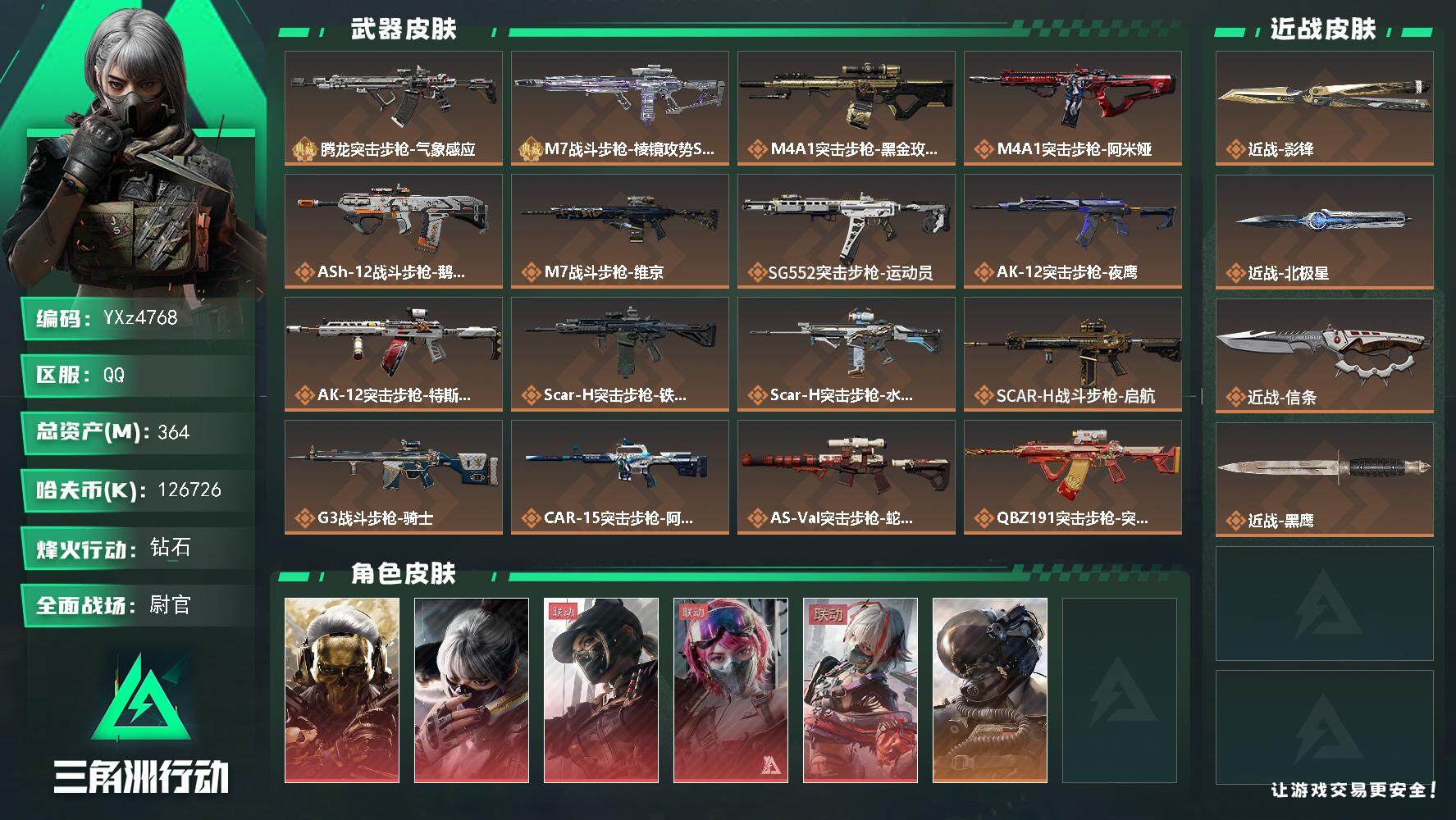 【高氪金土豪号-赛季热门装备号-满红皮+三刀皮+一典藏皮肤+蛟龙特战队-高额资产364M,哈夫币126M】【连体王者荣耀:王者贵族8,皮肤413,典藏2,珍品无双2,传说皮肤27,王者营地ID:405969386】【蚀金玫瑰.水墨云图.黑天际线.能天使午夜邮差.维什戴尔.蛟龙特战队.街头之王】【北极星.影锋.信条】【典藏外观】:腾龙突击步枪-气象感应(优品B-电属性)M7战斗步枪-棱镜攻势S2(优品B)【Q区三端互通】【无二次】YXz4768-特勤处:仓库9级/靶场7级/训练中心7级-总资产364.8m-哈夫币126m-烽火等级:60级【干员外观】:红狼-蚀金玫瑰,骇爪-水墨云图,露娜-