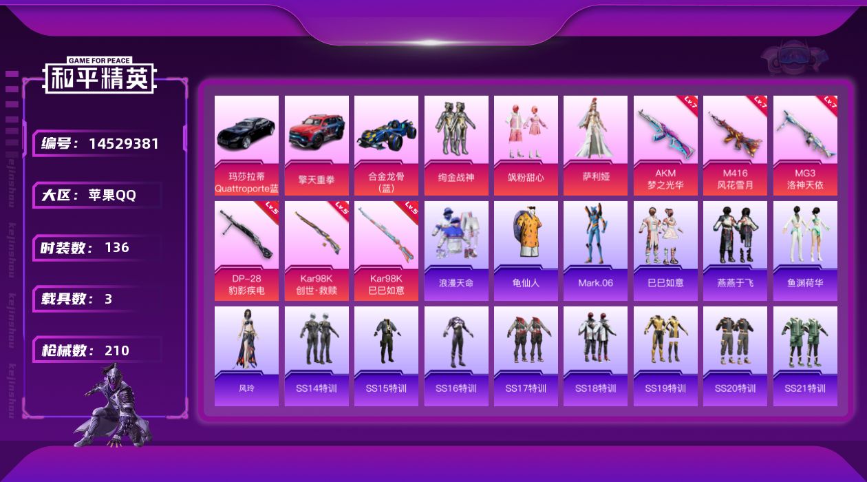 [14523710]4粉装 2特效枪 1载具 3印记 可二次 可修改实名 连体王者荣耀【热门装扮】:冰霜白皇,精灵迷巫,绚金战神,碧影闪光,蔷薇魔法师,奇迹天团,潮萌小黄鸭,浪漫波比【载具】:玛莎拉蒂Ghibli(粉)【稀有枪皮】:SCAR-L青春物语,Kar98K未来歌姬【四级特效枪】:四级SCAR-L-青春物语【三级特效枪】:三级Kar98K-未来歌姬【紫色装扮】:SS22特训,完美偶像,帅气教官,幻世战舞者,幻影武者,战地督导,战地菁英,夏日音浪,夜莺强袭者,SS5特训,人气偶像,冰川特警,冷焰舞者,刚毅裁决者,北国孤狼,坚韧舞者,瑞龙福将,团圆交子,SS18特训,水晶王族,梦起落英,碧波幻想,娇憨猪猪,萌趣咩咩,SS21特训,飞驰魅影,音速流光,SS19特训,英勇保护者,甜心亚梦,虚音幻奏,猎梦纪元,SS20特训,格斗先锋,龙魂突击队,霓虹街区,魅力单车,黄色运动,黑色伏地魔,龙的传人,雪山精英,牛气满满,特战装甲,甜蜜告白,甜蜜菠萝,疯狂小兔子,白色伏地魔,破蛋小黄鸡,派对绅士,海岛探路者,深蓝色名流,灰色格斗者,蓝色运动,街头潮人,跃动心情,酒红色名流,酷潮明星,长空猛禽,蓝色守护者,绮丽涂鸦,神秘领域,竞技勇士朋克,红色运动,缤纷果语,创世·幻影,Mark.06(新蓝螳螂),红潮炫舞,竞技名士,玉兔迎春,惊鸿侠骨,锦衣飞扬,SS25特训,热情海星,纯真浪花,SS26特训,深蓝冒险家,迷域探索者,SS8特训,SS9特训,云丝凤蟒,红酒骑士,SS6特训,星光纪元,玲珑飞花,拳皇97八神庵,炽焰拳师,格斗专家,银河圣歌,闪耀星光,黑色刀锋,精神漫游,核芯基因,SS7特训,冰爽海盐,科技之星,SS14特训,绯格组合,丛林猎人,传奇侦探,半糖蓝莓【优质战备】:初号机 觉醒Ver.降落伞,环太平洋降落伞,垂柳戏鸭降落伞,金风玉露降落伞,天星战神降落伞,银河战甲降落伞,春暖花开降落伞,梦幻火箭降落伞,梦幻火箭飞行器,星之信仰降落伞,炫紫旋律降落伞,飞行器-激战未来,暗翼战神降落伞