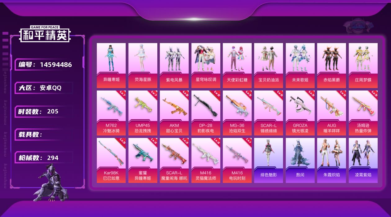 [14594486]连体王者荣耀安卓 手Q-9粉装-15特效枪-0载具-4粉色飞行器-89748热力值-18王牌印记-205套装-294枪皮【热门品类】:套装-奇异狩猎者,套装-龟仙人,角色-Mark.06【粉色套装】:粉装-宝贝奶油派,粉装-天使彩虹糖,粉装-庄周梦蝶,粉装-赤焰黑爵,粉装-紫电风暴,粉装-未来歌姬,粉装-星穹咏叹调,角色-荧海星豚,角色-异瞳寒姬【粉色枪皮等级】:AKM-甜心宝贝(六级),SCAR-L-锦绣绵绵(五级),SCAR-L-魔童闹海 哪吒(三级),M416-电玩时刻(一级),M416-灵猫魔法师(三级),GROZA-镜光银凌(五级),AUG-暖羊咩咩(五级),M762-冷魅冰骑(七级),蜜獾-异瞳寒姬(三级),UMP45-恐龙拽拽(七级),汤姆逊-热量炸弹(五级),Kar98K-巳巳如意(五级),Mk14-甜梦熊击(五级),DP-28-豹影疾电(五级),MG-36-沧焰双生(五级)【粉色枪皮】:AKM-甜心宝贝,SCAR-L-锦绣绵绵,SCAR-L-魔童闹海 哪吒,M416-电玩时刻,M416-灵猫魔法师,GROZA-镜光银凌,AUG-暖羊咩咩,M762-冷魅冰骑,蜜獾-异瞳寒姬,UMP45-恐龙拽拽,汤姆逊-热量炸弹,Kar98K-巳巳如意,Mk14-甜梦熊击,DP-28-豹影疾电,MG-36-沧焰双生【粉色飞行器】:庄周梦蝶飞行器,灵猫魔法师飞行器【粉色降落伞】:极限特训降落伞,甜心宝贝降落伞,暗夜玫瑰降落伞,流星咚咚降落伞,恐龙拽拽降落伞,庄周梦蝶降落伞,冷魅冰骑降落伞,天星战神降落伞,精灵梦叶罗丽降落伞,创世·救赎降落伞,千金淑猫降落伞,星穹咏叹调降落伞,灵猫魔法师降落伞,绯穹魔姬降落伞,异瞳寒姬降落伞【稀有套装】:套装-龟仙人,套装-巳巳如意,套装-圣穹绘梦,套装-小鸟芋圆,套装-雏菊兔兔,套装-萝兰蝴蝶,套装-小熊娃娃,角色-摩登魅猫,角色-幽秘之星,套装-粉恋花,套装-紫幽梦,套装-蓝冰羽,套装-星影赞美诗,套装-彩虹兔,套装-云朵鹅,套装-雪绒豹,角色-乐音,角色-夜瞳黯灵,套装-朱霞炽焰,套装-凌霄紫焰,套装-擎苍青焰,角色-敖闰,角色-绯色魅影,套装-炫彩糖果【稀有枪皮】:AUG-冰晶雪宝,AKM-2P战斗服款,AKM-冰凉西瓜,AKM-夜灯,AKM-奇异狩猎者,AKM-彩虹符号,AKM-影袭,AKM-恐龙拽拽,AK